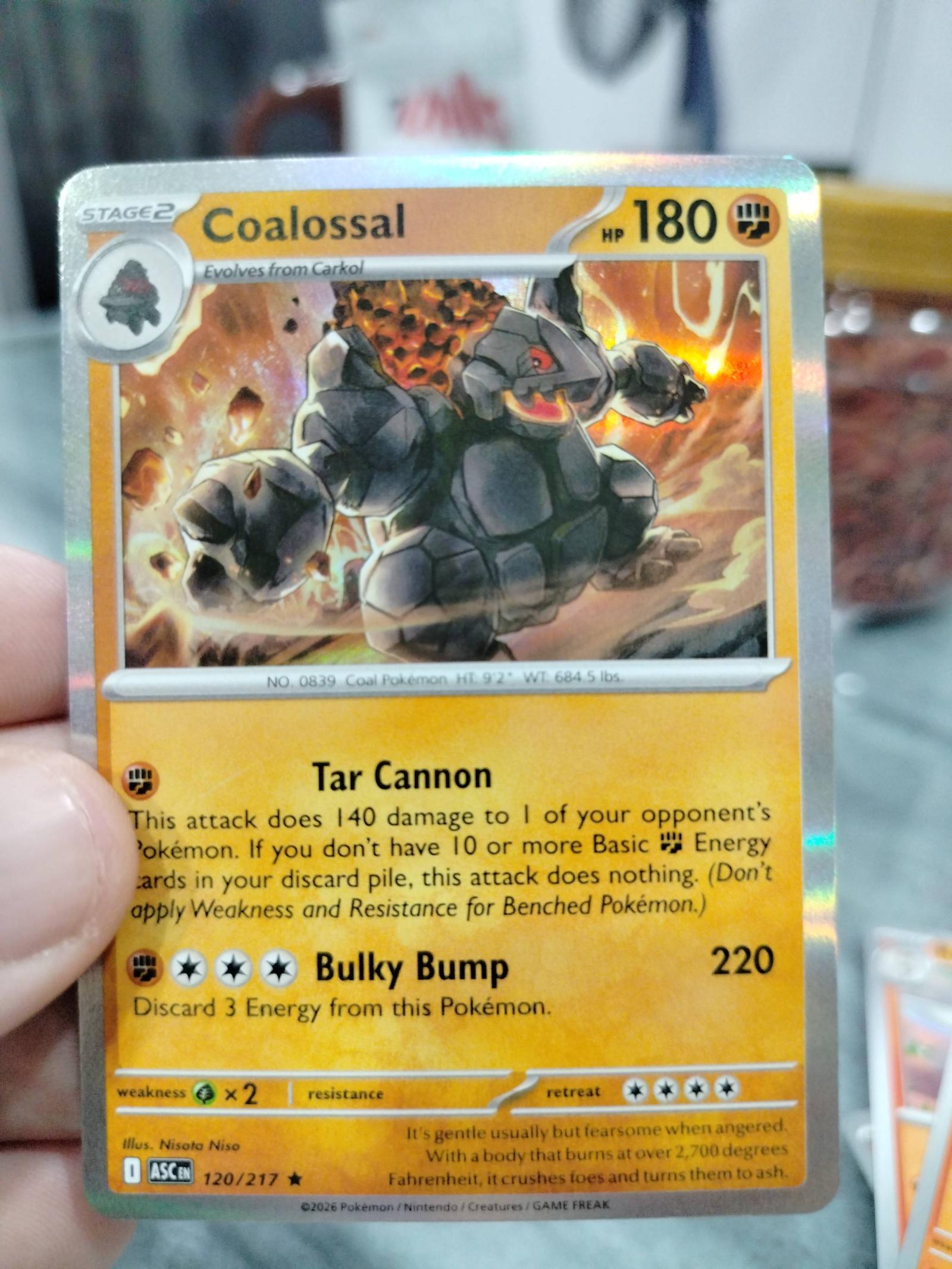 Coalossal (Card No. 120) from the Sword & Shield Astral Radiance set (ASC) illustrated by Nisoto Niso. This holographic card features powerful attacks Tar Cannon and Bulky Bump. Playable in competitive meta and highly collectible. Foil holo treatment.