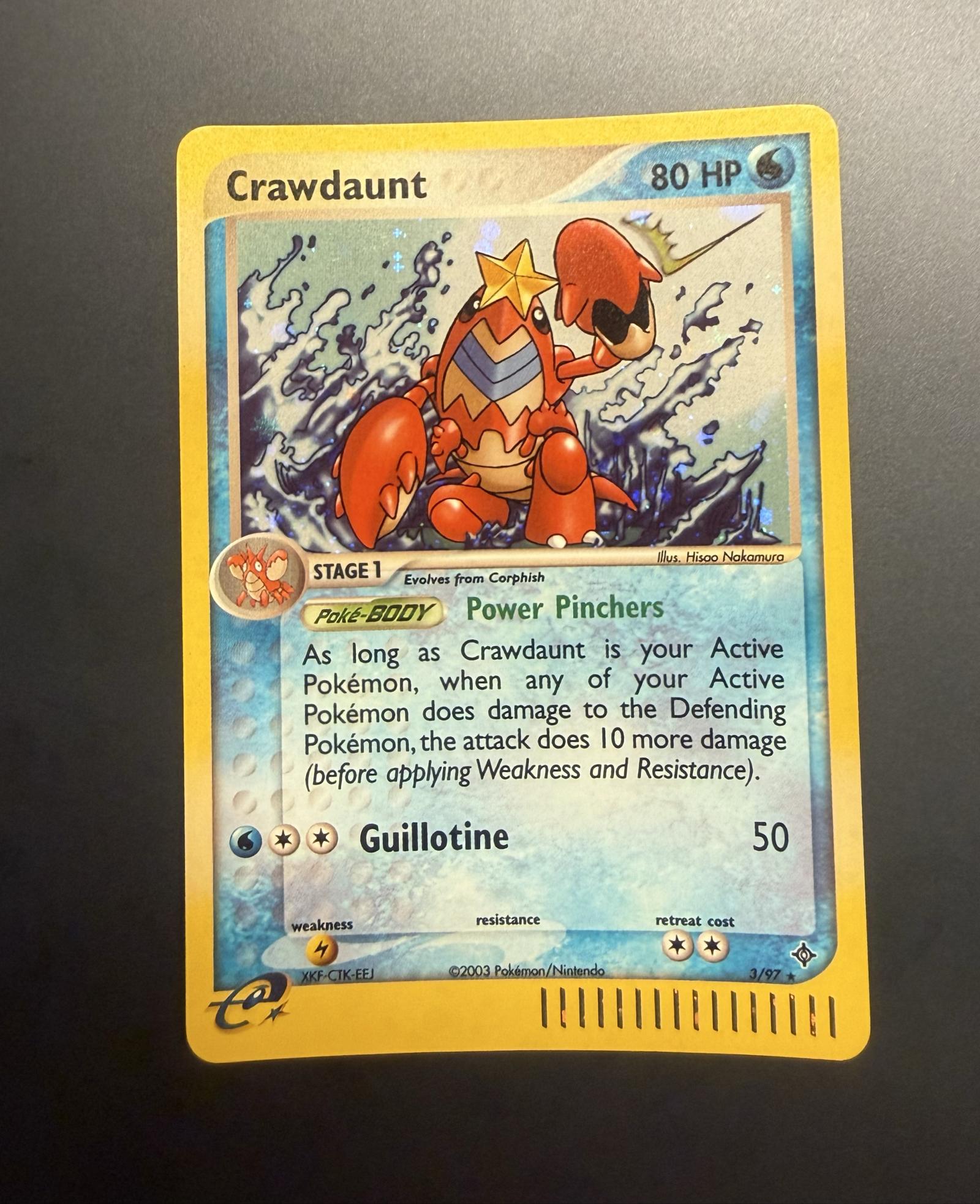 Crawdaunt card from the EX Dragon set, card number 3/97. Illustrated by Hisao Nakamura. Released in 2003 by Pokémon/Nintendo. This is a holo foil card featuring the Power Pinchers Poké-Body and Guillotine attack. Language code is English, and the card is highly collectible with some limited playability in casual decks. Card code XKf-CTK-EEJ is noted on the card.