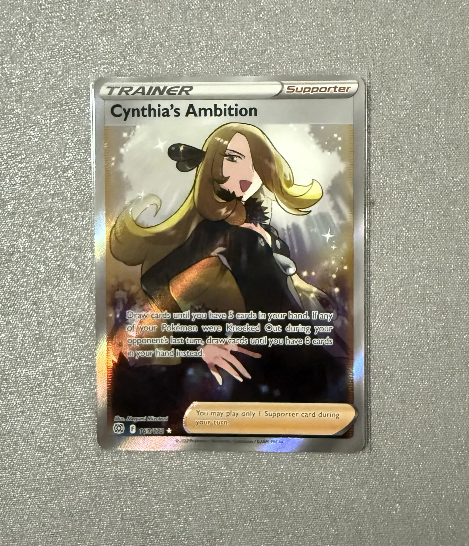 Cynthia's Ambition (Trainer Supporter) card from Pokemon TCG. Card code 169/172, illustrated by Megumi Mizutani, from the Brilliant Stars set. This is a foil full art card. It is playable in the Pokemon TCG meta and is sought after for both collection and competitive play.