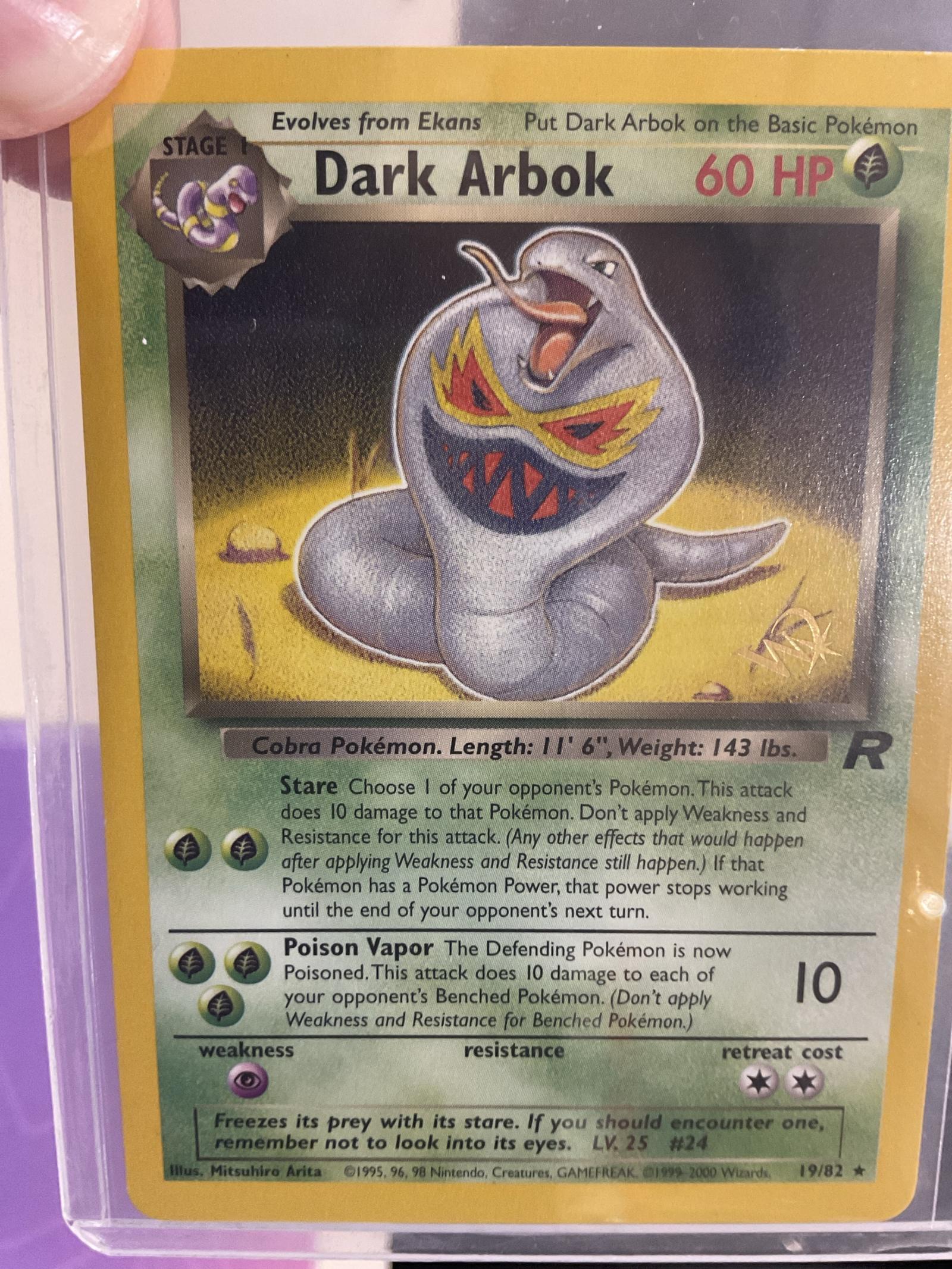 Dark Arbok from the Team Rocket Unlimited set, card number 19/82, illustrator Mitsuhiro Arita. 1st Edition with foil stamp on right. This card is collectible and part of the classic Team Rocket expansion from 1999-2000. Language: English. Not a secret rare or full art card. This card is not considered highly playable in the current meta.