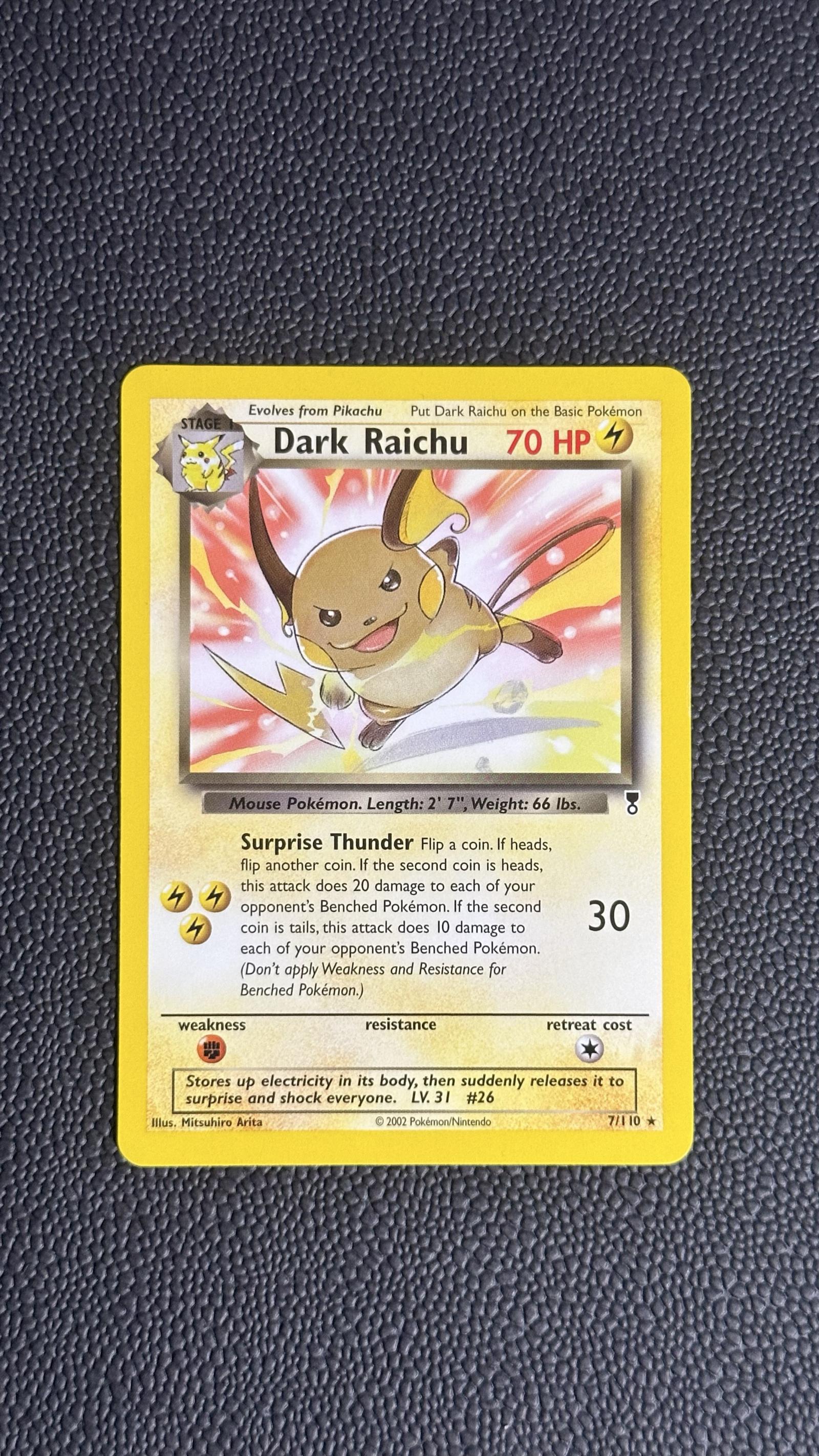 Dark Raichu (Deck Exclusive) #7/110 from the Legendary Collection set, illustrated by Mitsuhiro Arita. This 2002 English card features a non-holo treatment. It is a collectible card known for its unique Dark Raichu artwork. While playable, it is more sought after by collectors for its art and scarcity.