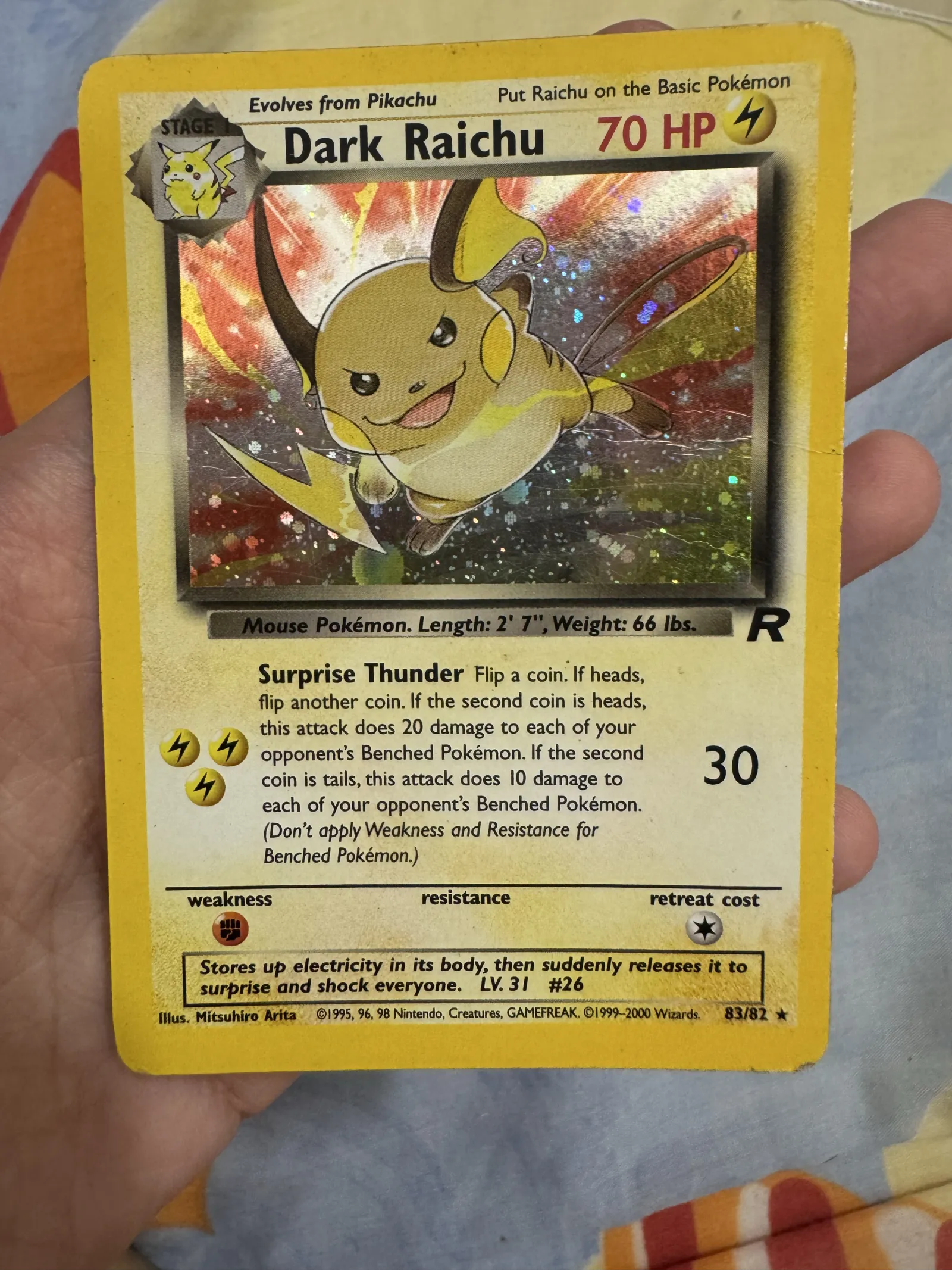 Dark Raichu #26 from Team Rocket set (83/82), illustrated by Mitsuhiro Arita. This is a holo foil card from the 1999-2000 Wizards of the Coast Pokémon TCG. The card is playable but generally more valued as a collector's item, especially given its secret rare numbering (83/82). The card is in English and features the 'Surprise Thunder' attack.