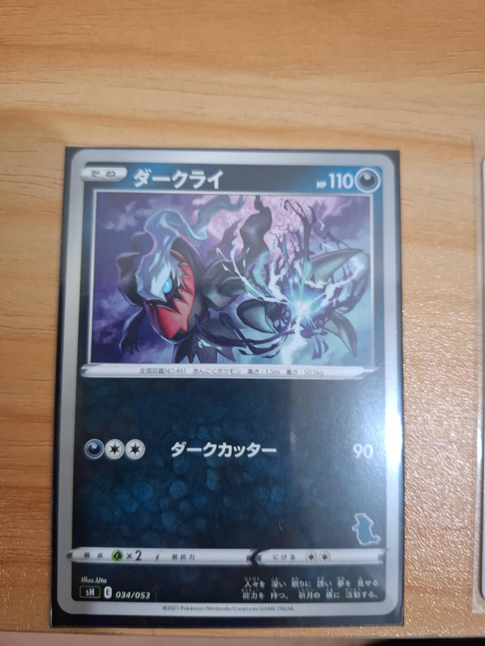 Darkrai, card number 034/053, set sH, Japanese language. Illustration by Uta. From a 2021 Pokémon set by Nintendo/Creatures/GAME FREAK. This card is not a foil or special printing. Darkrai is playable in the Pokémon TCG meta as a Dark-type Basic Pokémon with 110 HP and the attack 'Dark Cutter' that does 90 damage.