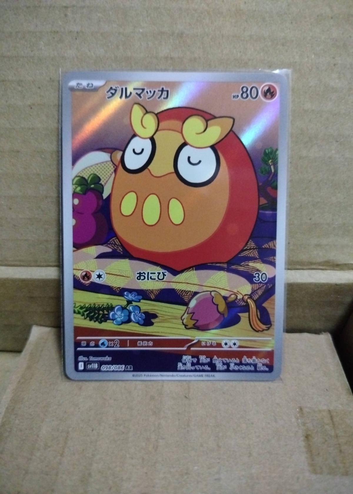 This is a Japanese Darumakka Art Rare (AR) card from the Scarlet & Violet: Triplet Beat set (sv1b). The card number is 98/86. The illustration is by Tomokazu. This is a holofoil card, as seen from the reflective surface. Card code is 098086. This card is mostly collectible due to its art rare status and is not considered highly competitive in the meta. Not slabbed or graded.