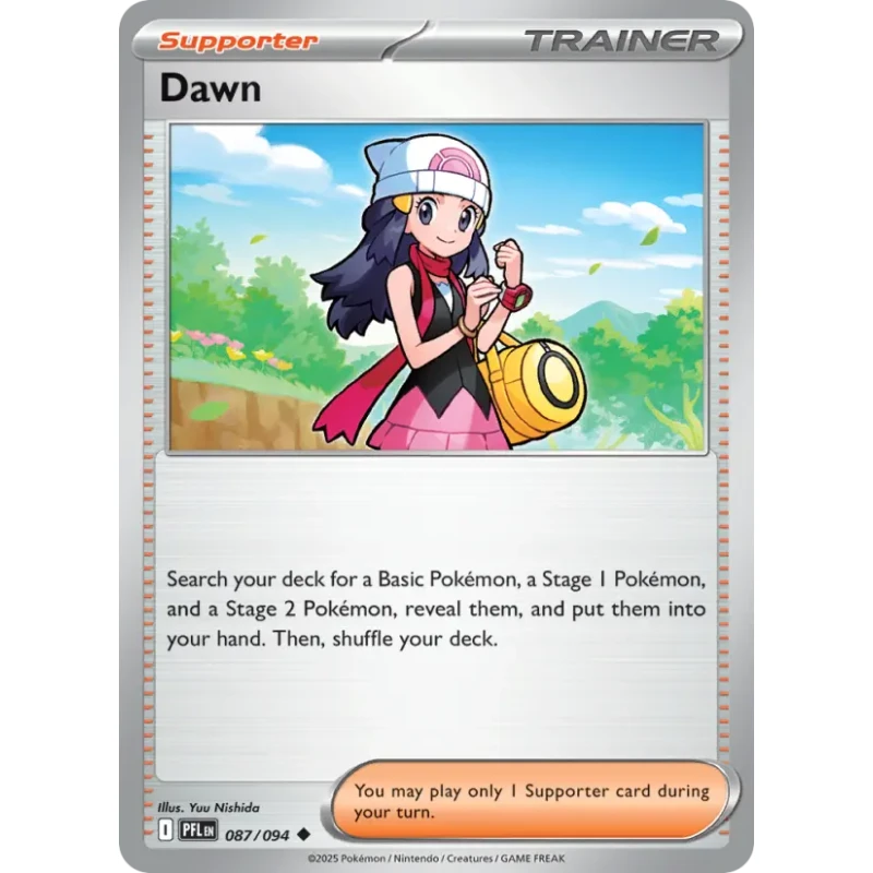 Notable features: classic Dawn artwork by Yuu Nishida; standard printing (no foil, prestige, or showcase variant); clear set code and card number (PFL 087/094) visible on the lower left. Functionally this is a Supporter Trainer card that remains playable in current Standard/Expanded decks that use Supporter search effects — it searches a Basic, a Stage 1 and a Stage 2 and puts them into your hand, making it useful for stage‑evolution toolbox strategies as well as collectors who want representative playables from the 2025 PFL set.