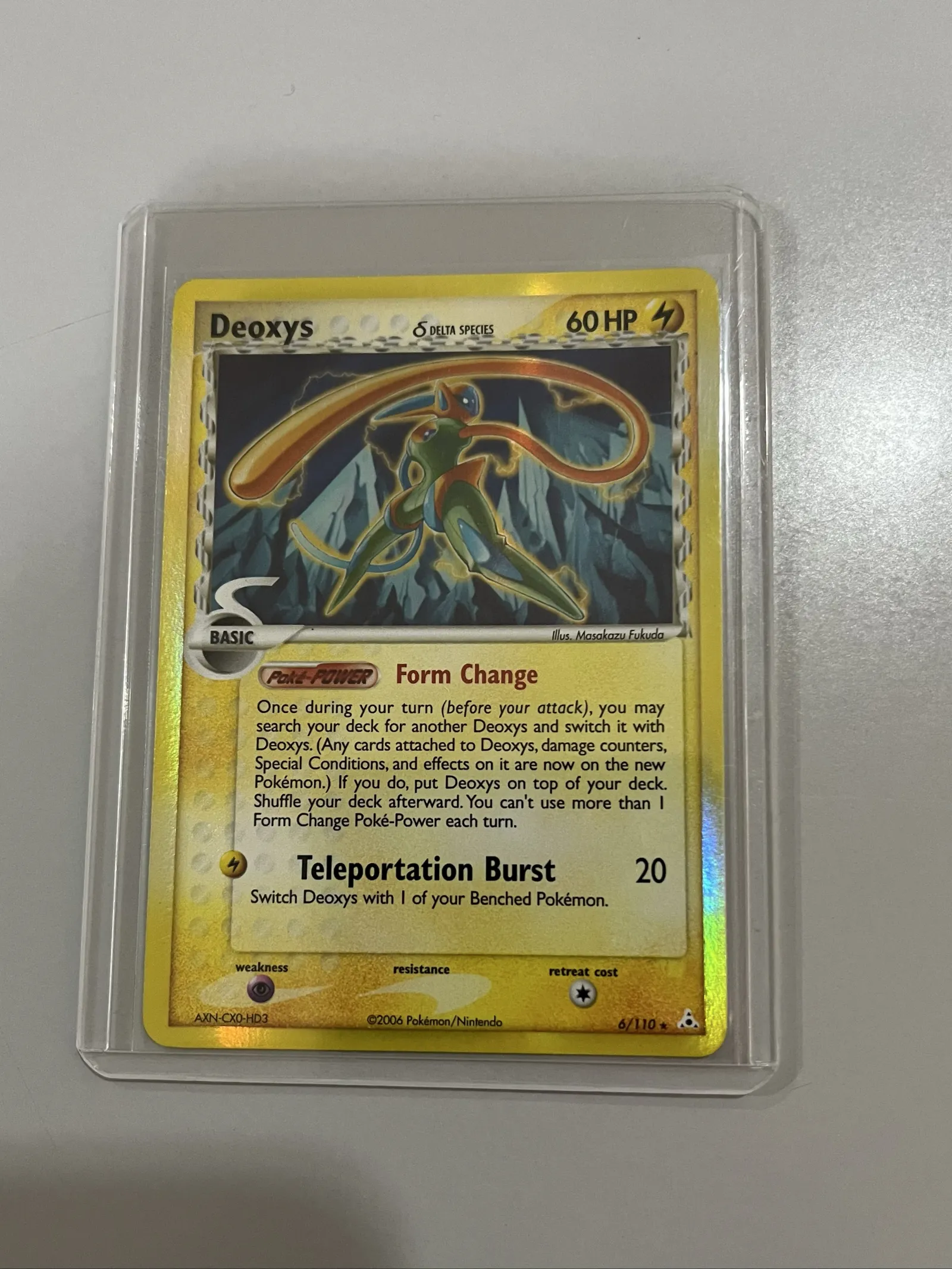 This Deoxys 6/110 Holon Phantoms comes from the EX Holon Phantoms era, a set known for its unique holographic style and experimental designs from the mid-2000s.