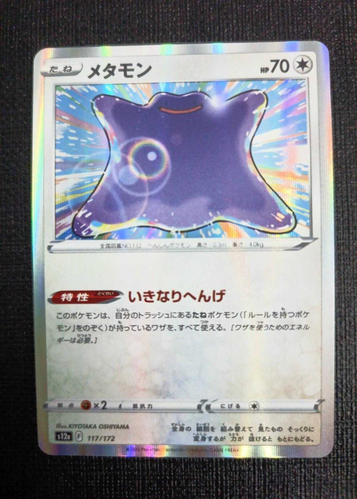 メタモン (Ditto) from the Pokémon TCG set S12a VSTAR Universe, featuring artwork by Kiyotaka Oshiyama. This is card 177 from the set, with the card set code S12a and 6-digit code 177/172. The card is in Japanese, foil treated (holo), and is mainly sought after for collecting due to its unique set and artwork. The card is playable in the meta for certain deck strategies. No grading or slab information is present.
