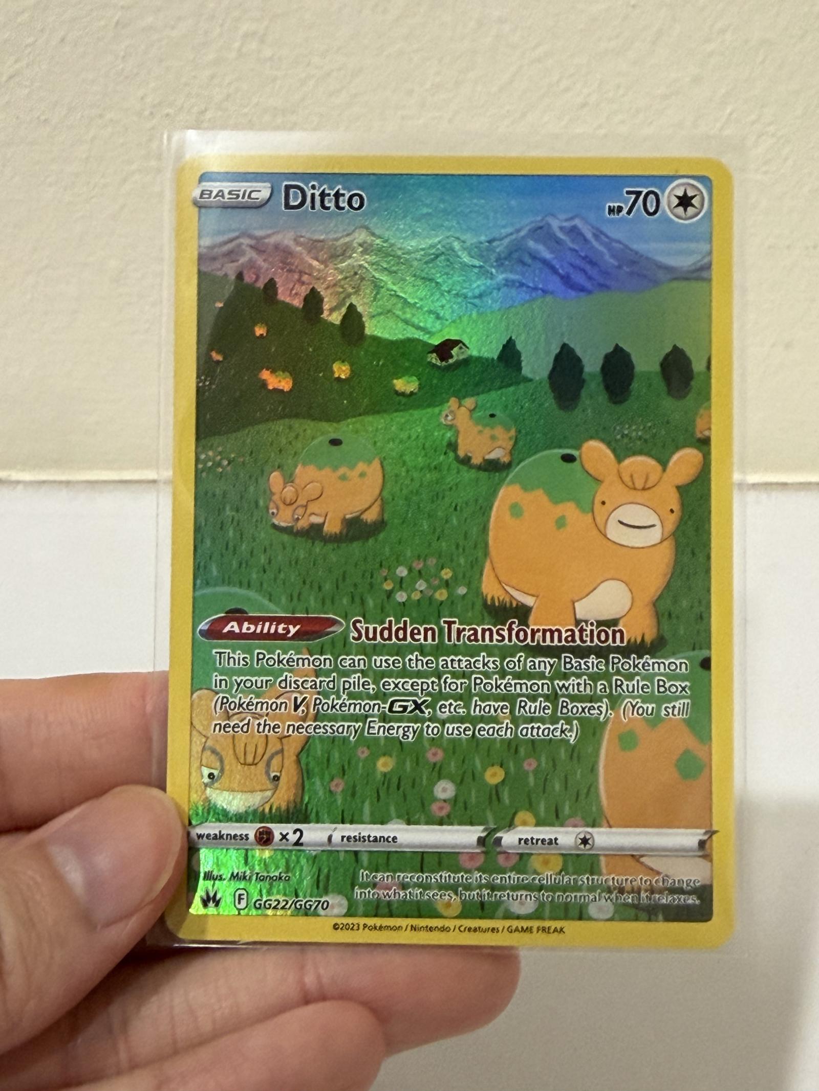 Ditto card from the Pokemon GG22 set with collector number 70. Illustrated by Miki Tanaka. Features the ability Sudden Transformation. The card is holofoil and is in English. This card is part of the GG22 set released in 2023, playable in casual meta and also sought after by collectors for its unique artwork and ability.