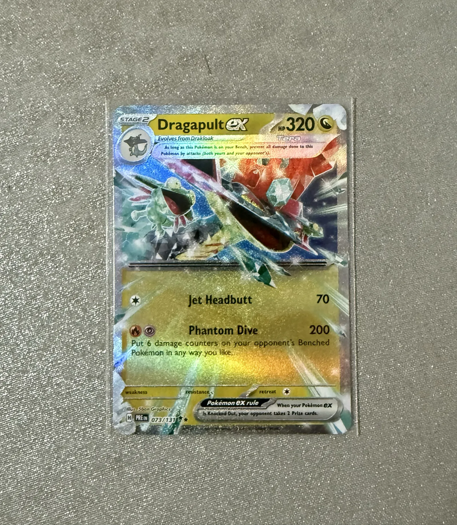 Dragapult ex from the Prismatic Evolutions set. Card number 073/131. Artist: 5ban Graphics. This holo foil card features powerful attacks Jet Headbutt and Phantom Dive. It is a collectible card playable in the Pokemon TCG meta. The card is a Stage 2 Dragon-type Pokémon EX with 320 HP.