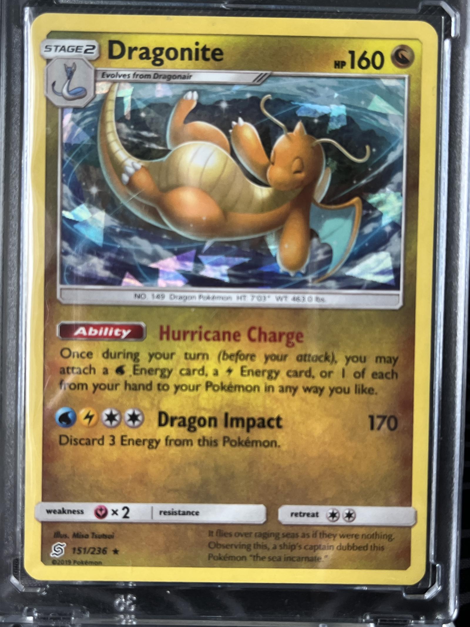 Dragonite card from the Sword & Shield set, collector number 151/236. Illustrated by Misa Tsutsui, this card features the Hurricane Charge ability and Dragon Impact attack. The card is ice holofoil and was printed in 2019. Suitable for both collectors and playable in formats using Sword & Shield cards.