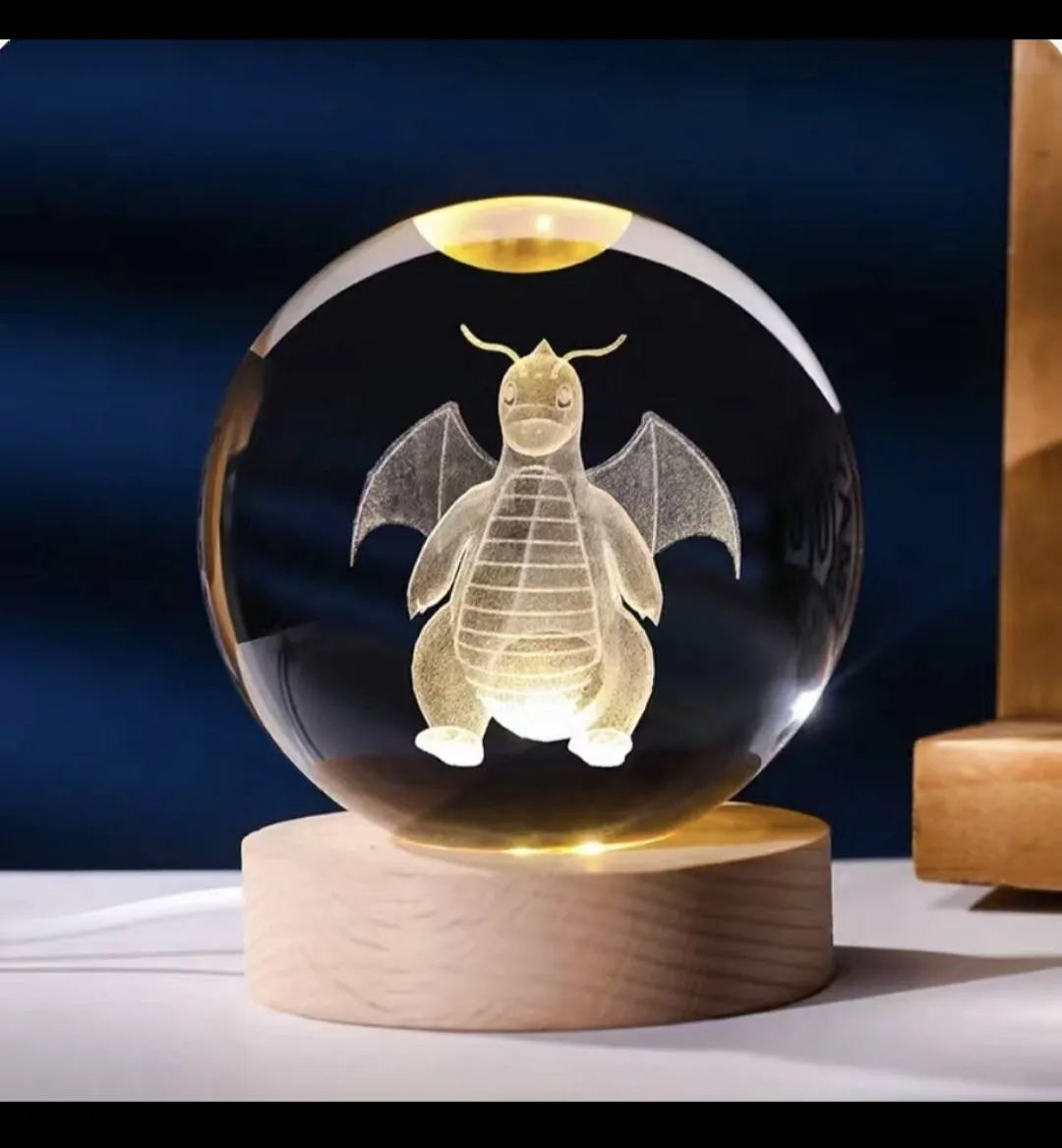 Notable features: Laser-etched 3D Dragonite image inside a clear crystal sphere; wooden LED base that produces a steady warm glow; compact tabletop size ideal for a bedside night light or shelf display; lightweight and easy to move. The piece is finished neatly with no visible chips or cracks in the glass and shows only light surface wear consistent with very good condition.