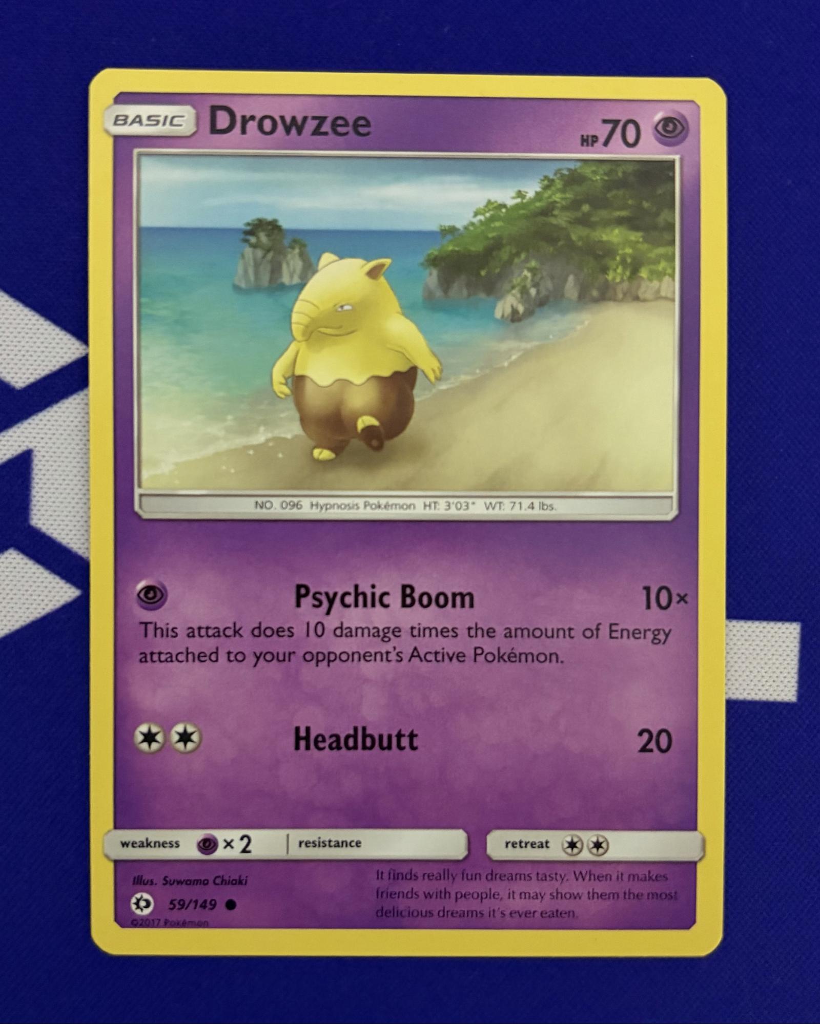 Drowzee card number 59/149 from the Sun & Moon set. Illustrator: Suwama Chiaki. This is a common, non-foil, normal print card featuring the Psychic Boom and Headbutt attacks. It is playable in casual and some competitive decks due to its attacks. No special treatments or grading applied.