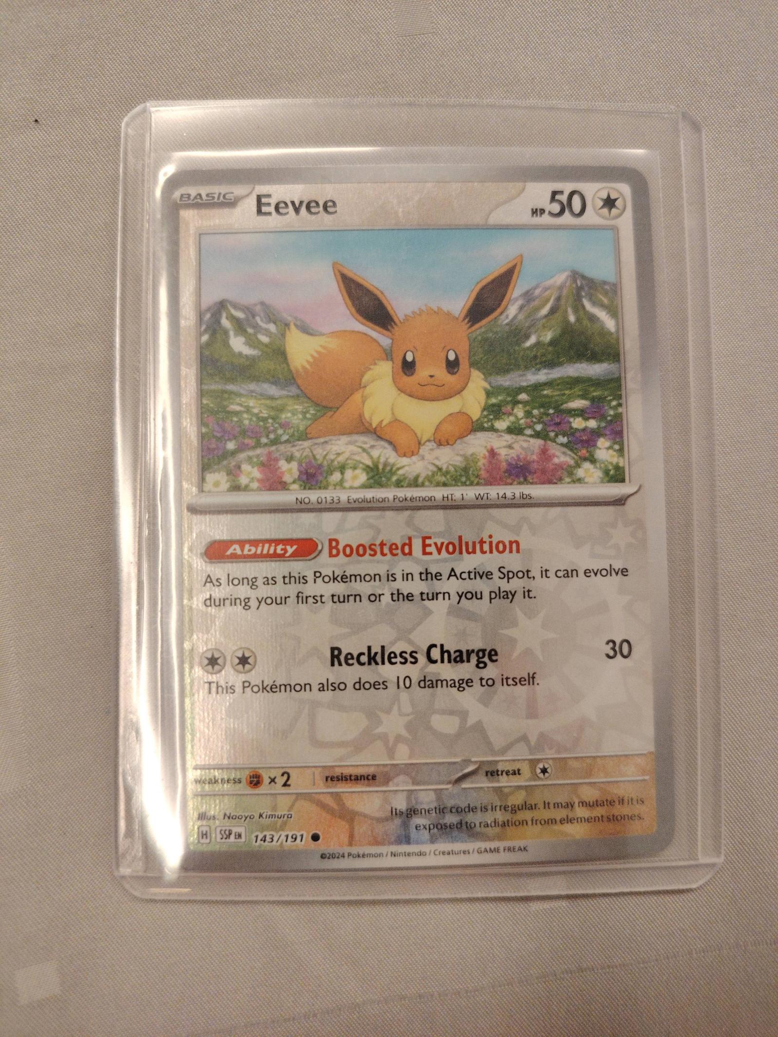 Eevee card number 143/191 from the Sword & Shield set (SSP subset) in English. Illustrated by Naoyo Kimura. Features the Ability 'Boosted Evolution' and attack 'Reckless Charge'. This card is a holo foil, collectible, and playable in current meta. Card code 143/191.
