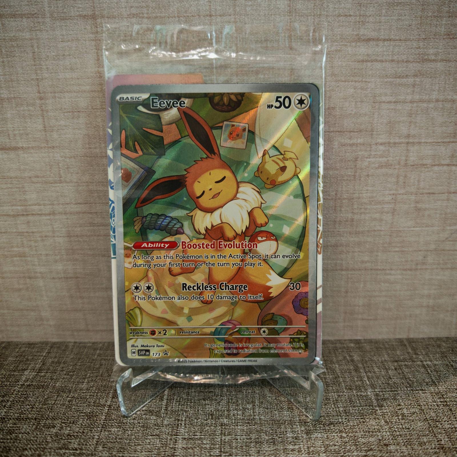 Eevee card with promo number SVP173 from the Pokémon Scarlet & Violet Promo set. Illustrated by Makura Toma. Holofoil card featuring the Ability Boosted Evolution and attack Reckless Charge. Playable in certain decks and also highly collectible due to the unique art and showcase style. Card code: 173/SVP. English language.