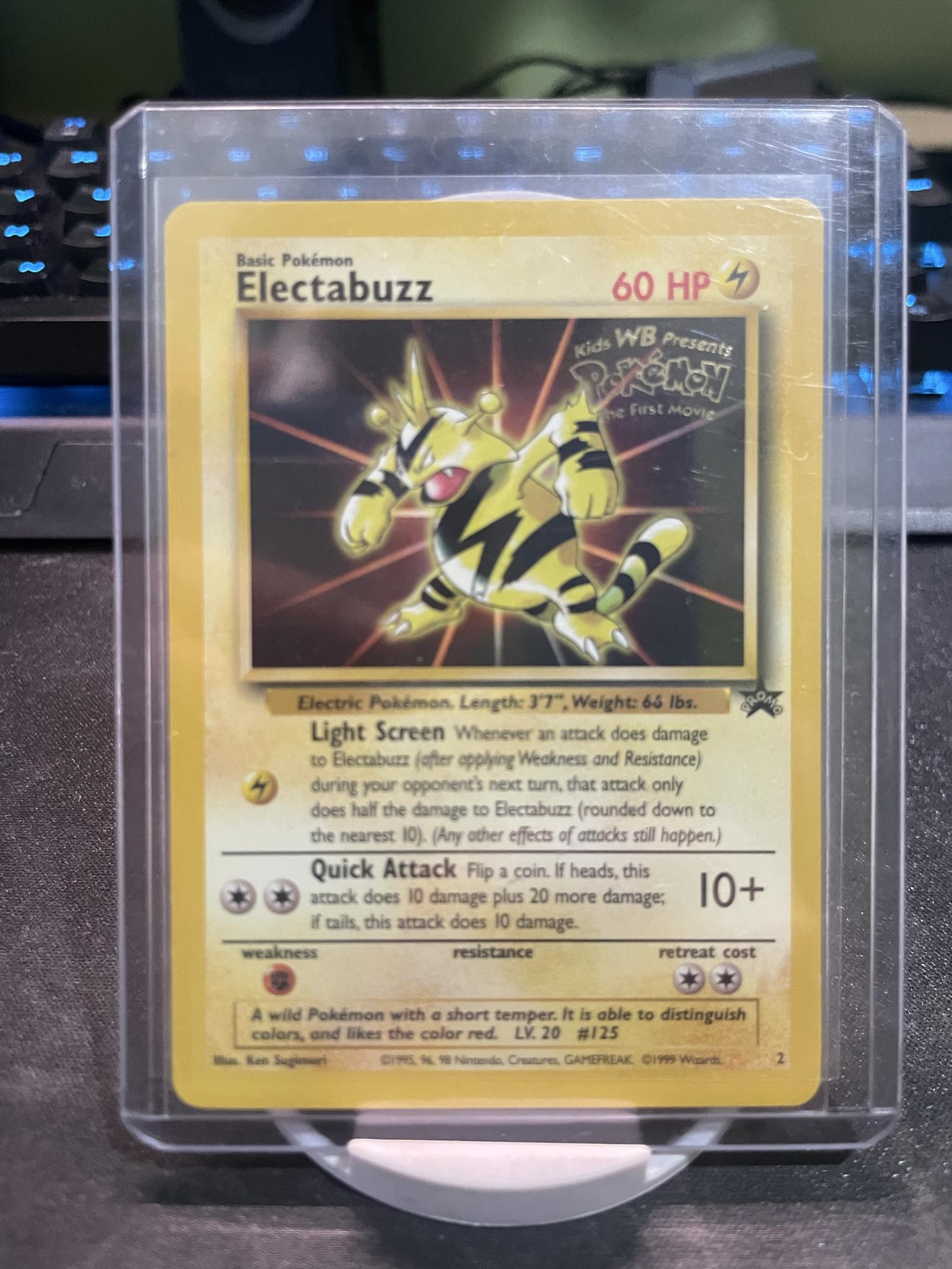 Electabuzz promo card from Pokémon The First Movie set, card number 2 out of 82. English language, printed by Wizards of the Coast in 1999. Artist: Ken Sugimori. This is a non-foil card featuring the special Kids WB Presents logo. Playable in various formats as a basic Electric-type Pokémon. Collectible piece from the movie promotion series.