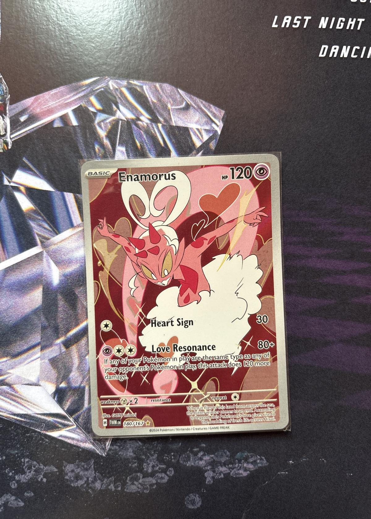 Enamorus card from the Pokémon TCG Temporal Forces set, card number 180/167, illustrated by GOTO minori. This is a holo rare card with 'Heart Sign' and 'Love Resonance' attacks. The card is in English and features a foil treatment. Card code: 005/2024. Primarily collectible due to its Secret Rare status, but also legal for play in standard format. No grading or slabbed authentication present.