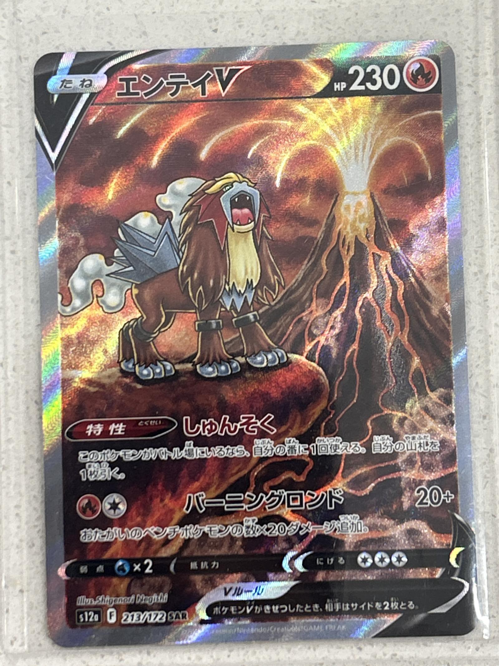 Entei V #213/172 from the Japanese Pokemon set S12a. Artist: Shigenori Negishi. This is a secret rare full art holo foil card. It has 230 HP and features powerful abilities making it viable for play in standard meta decks, though it is also highly collectible due to its rarity and artwork.