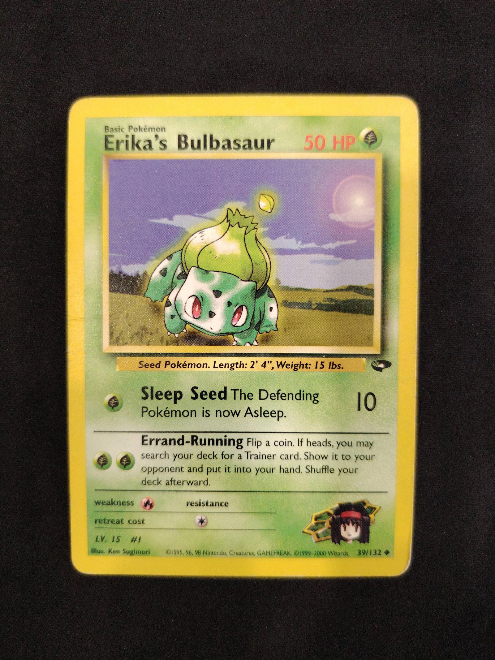 Erika's Bulbasaur from the Gym Heroes set, card number 39 out of 132. Illustrated by Ken Sugimori. The card is in English and is a normal non-foil print. The card features special gameplay effects like Sleep Seed and Errand-Running and is collectible with some playable potential depending on the format.