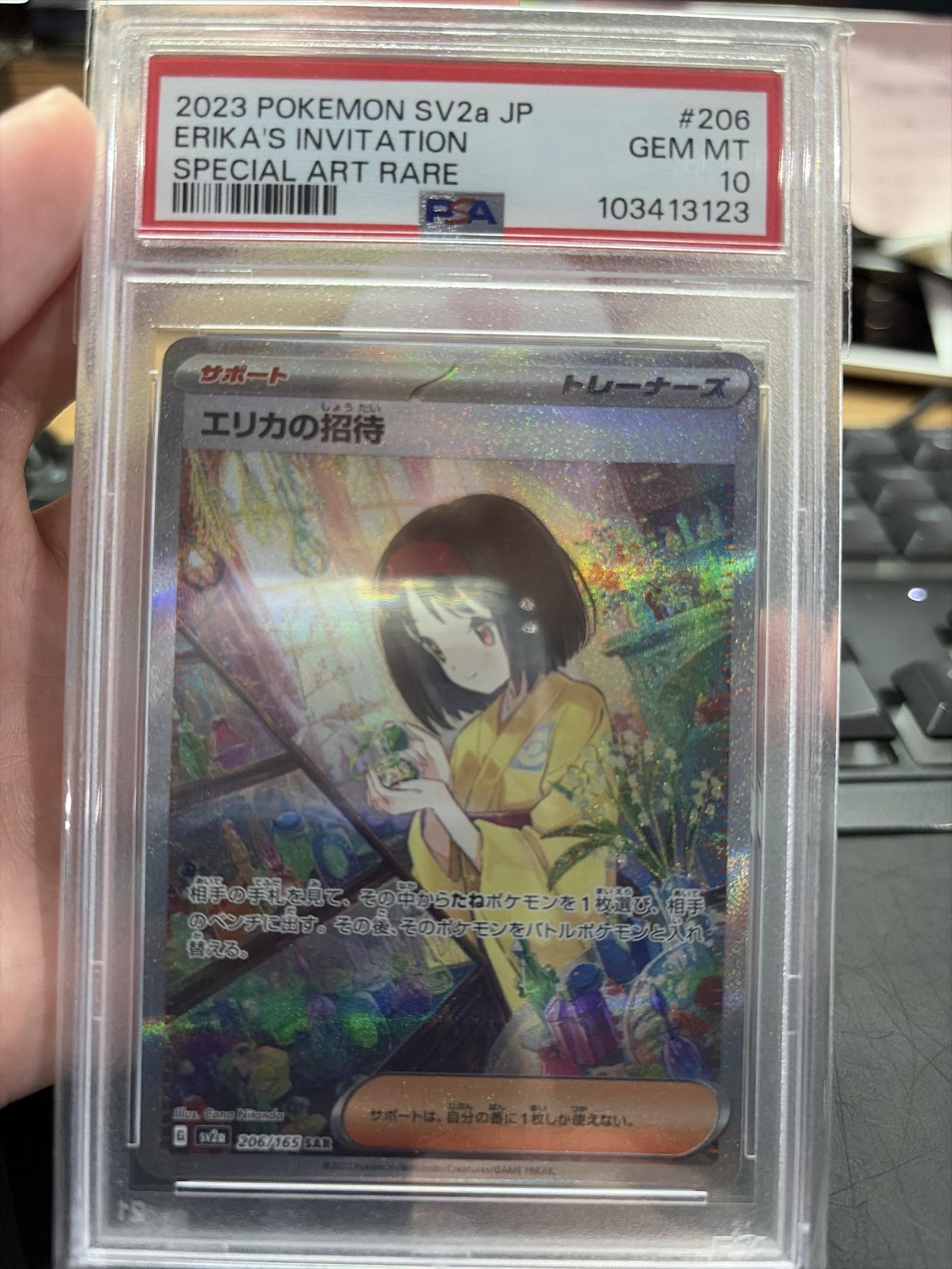 Graded PSA 10 GEM MT Erika's Invitation Special Art Rare card from the 2023 Pokemon Scarlet & Violet 2a (SV2a) set. Japanese language, card number 206/165. The card features artwork by Ryo Ueda. This foil special art card is highly collectible and not typically used in the competitive meta.