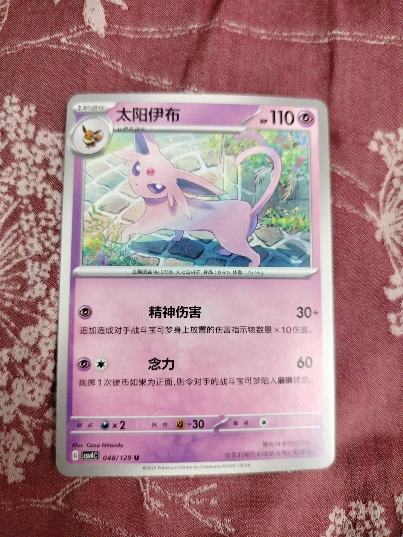 Espeon (太阳伊布) card from the 2025 Pokémon TCG set, card number 048/129, illustrated by Cona Nitanda. The card is in Chinese and features holo treatment. This card is playable in the Pokémon TCG meta and is collectible for fans of Espeon.