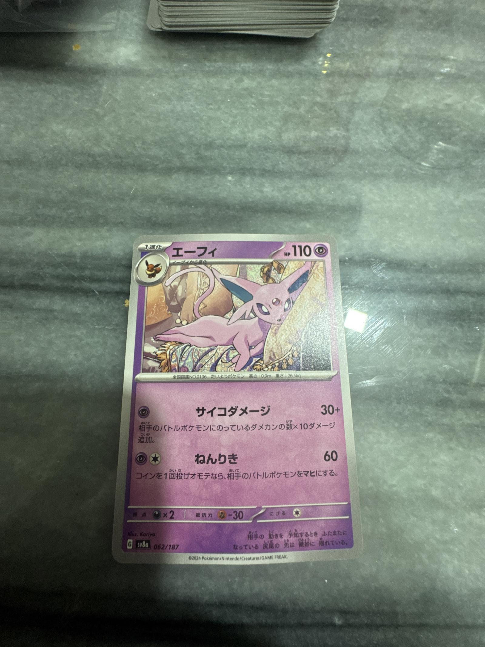 Japanese Espeon card from the SV08 set, card number 062/187. Artist: Kariya. This card is from the 2024 Pokémon TCG set. It is a Psychic type with 110 HP. The card is not foil and has a normal printing treatment. Playable in meta with solid Psychic attacks.