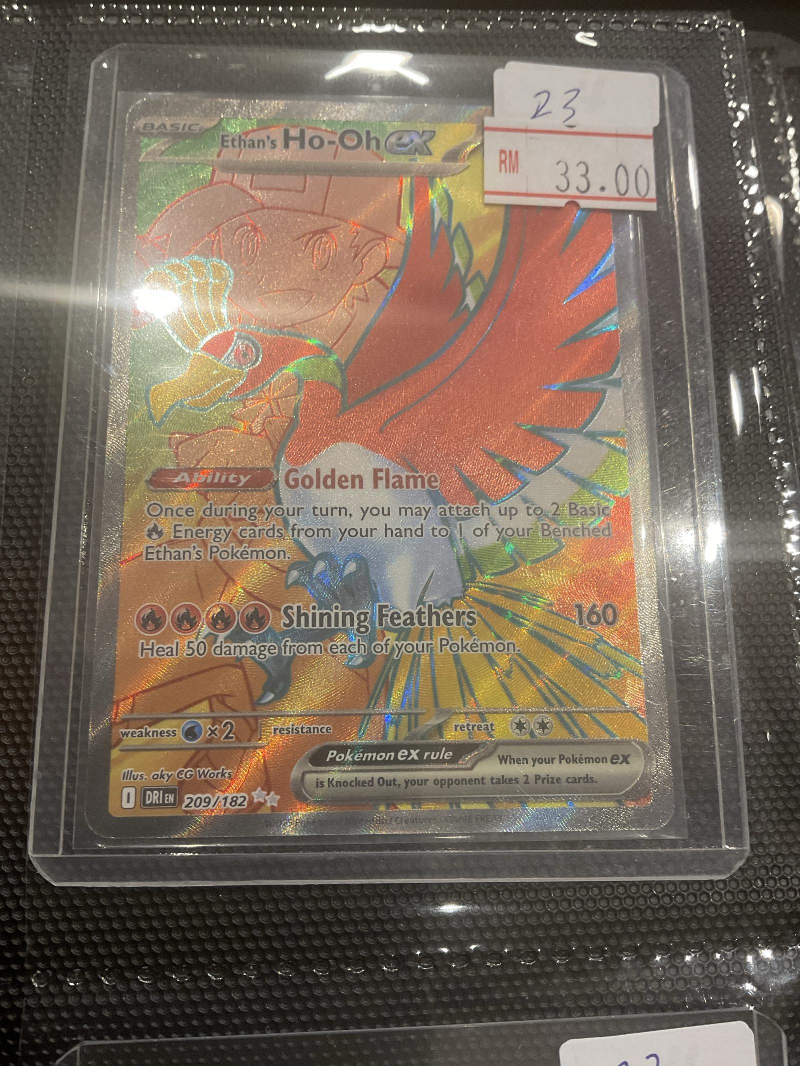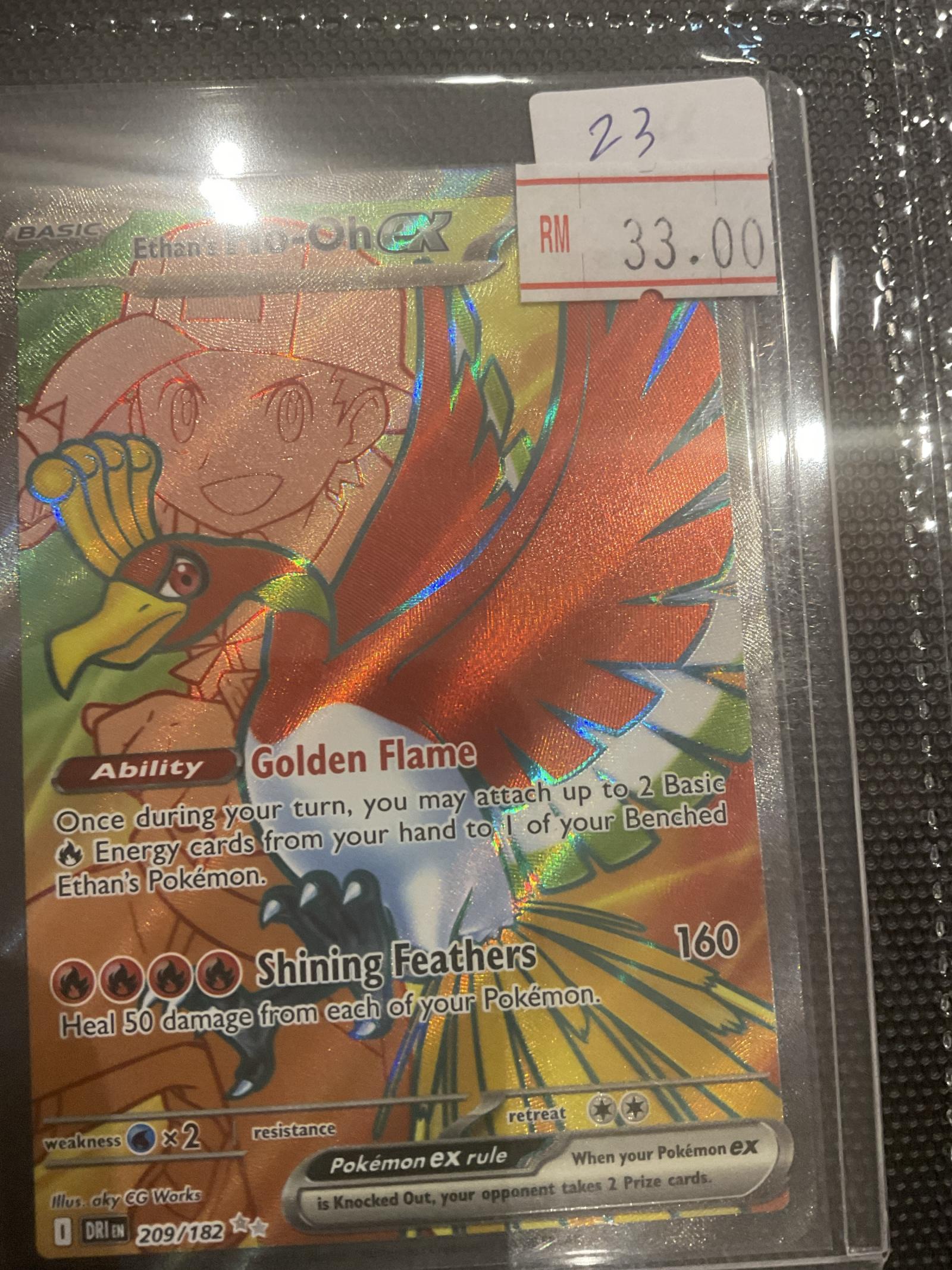 Ethan's Ho-Oh EX from the Dragon Majesty (DRM) set, card number 209 out of 182, illustrated by aky CG Works. This is a Secret Rare holofoil card featuring the Golden Flame ability and Shining Feathers attack. Playable in some formats, it is a special collectible card for Pokemon TCG enthusiasts.