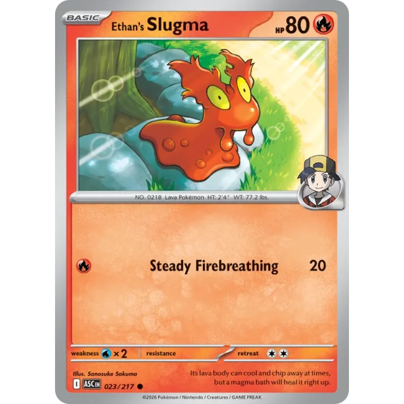 Ethan's Slugma from the 2026 Pokemon TCG set. Card number 023/217, illustrated by Sanosuke Sakuma. This is a non-foil card. It features the move Steady Firebreathing and is a basic Fire-type Pokemon. Suitable for collectors and casual play.