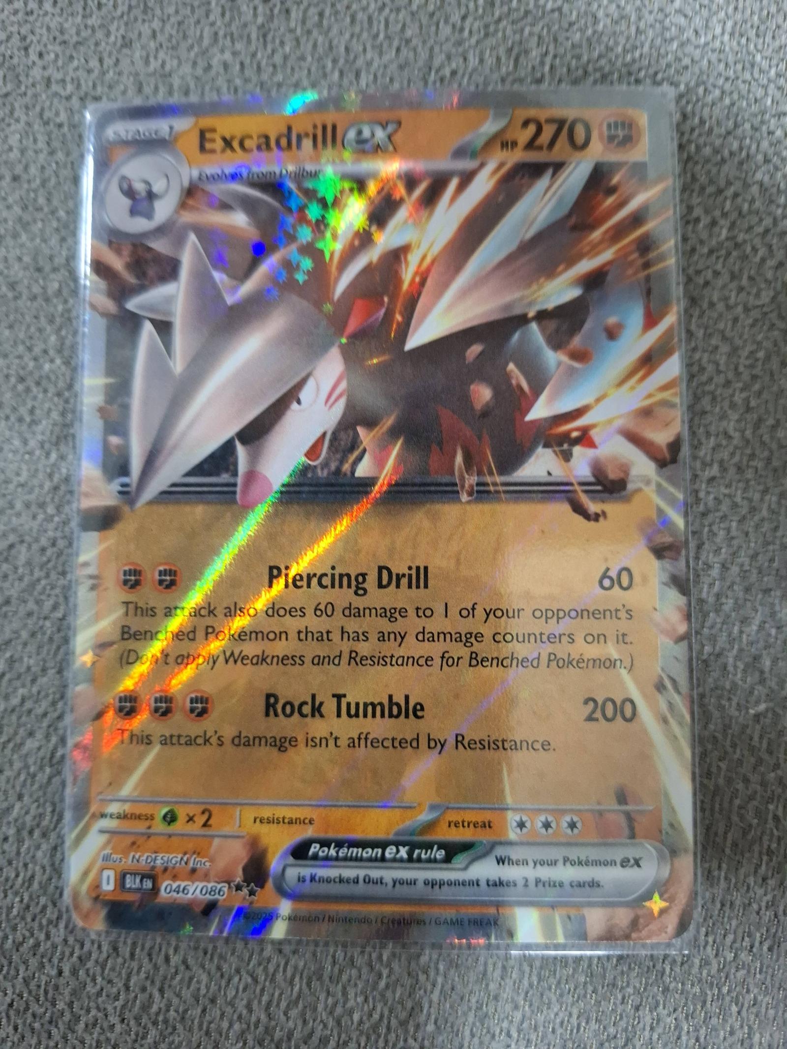 Excadrill ex card from the Black & White (BLK) set, card number 046/086. Illustrated by N-DESIGN Inc. This holographic EX card features powerful attacks Piercing Drill and Rock Tumble. It is collectible and holds some playability in certain metas. The card is foil and in good collectible condition.