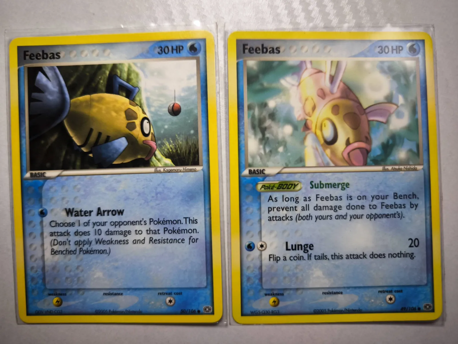 Two Feebas Pokémon cards from the Emerald Set Gen 3 English series. Artist is Jagemaru Himeno Sugimori & Atsuko NIshida. These cards are playable but not typically considered top meta cards, more collectible for fans & collectors.