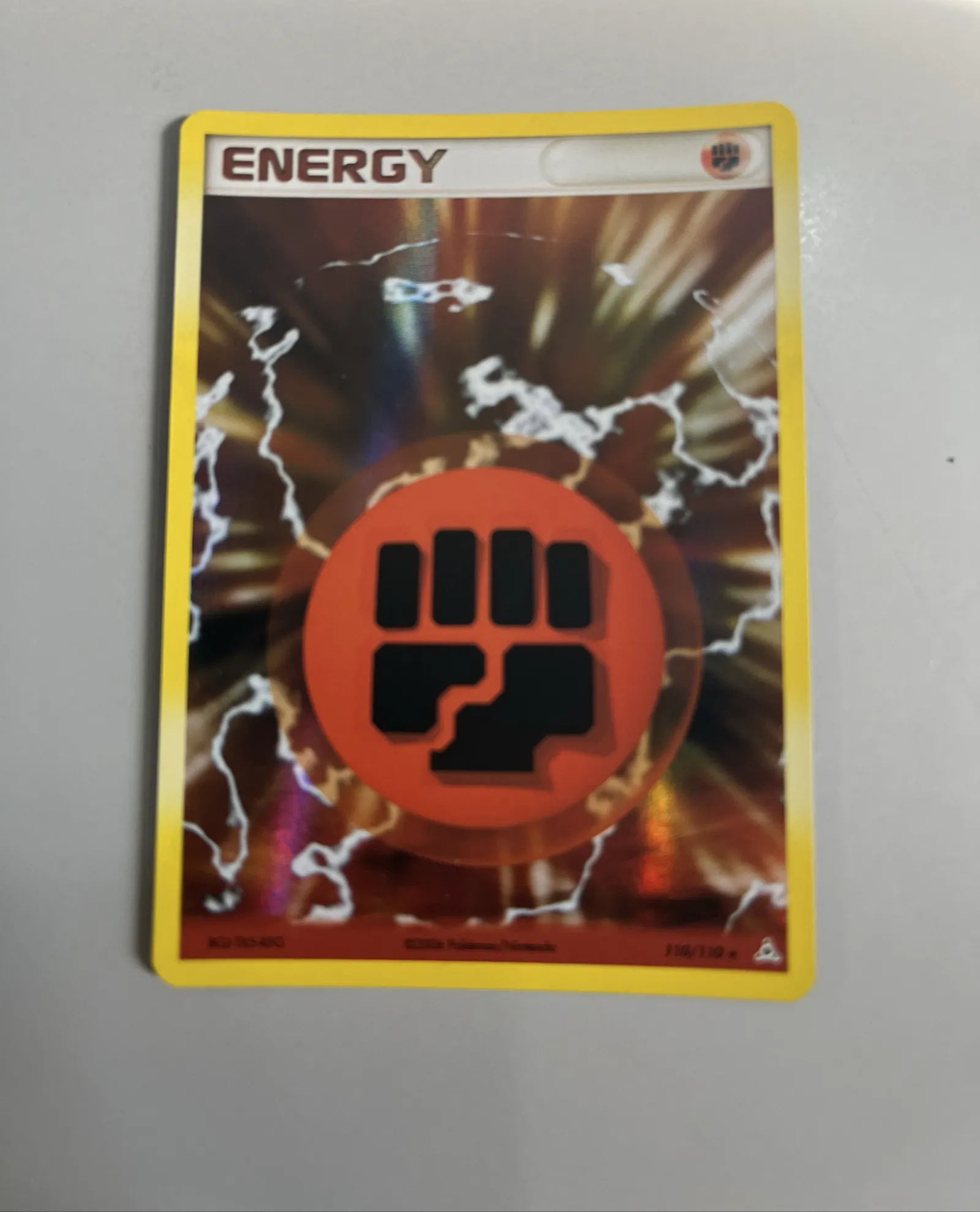 This Fighting Energy symbol card stands out as a holo rare, featuring a full holographic finish that gives the entire card a reflective, shimmering effect.