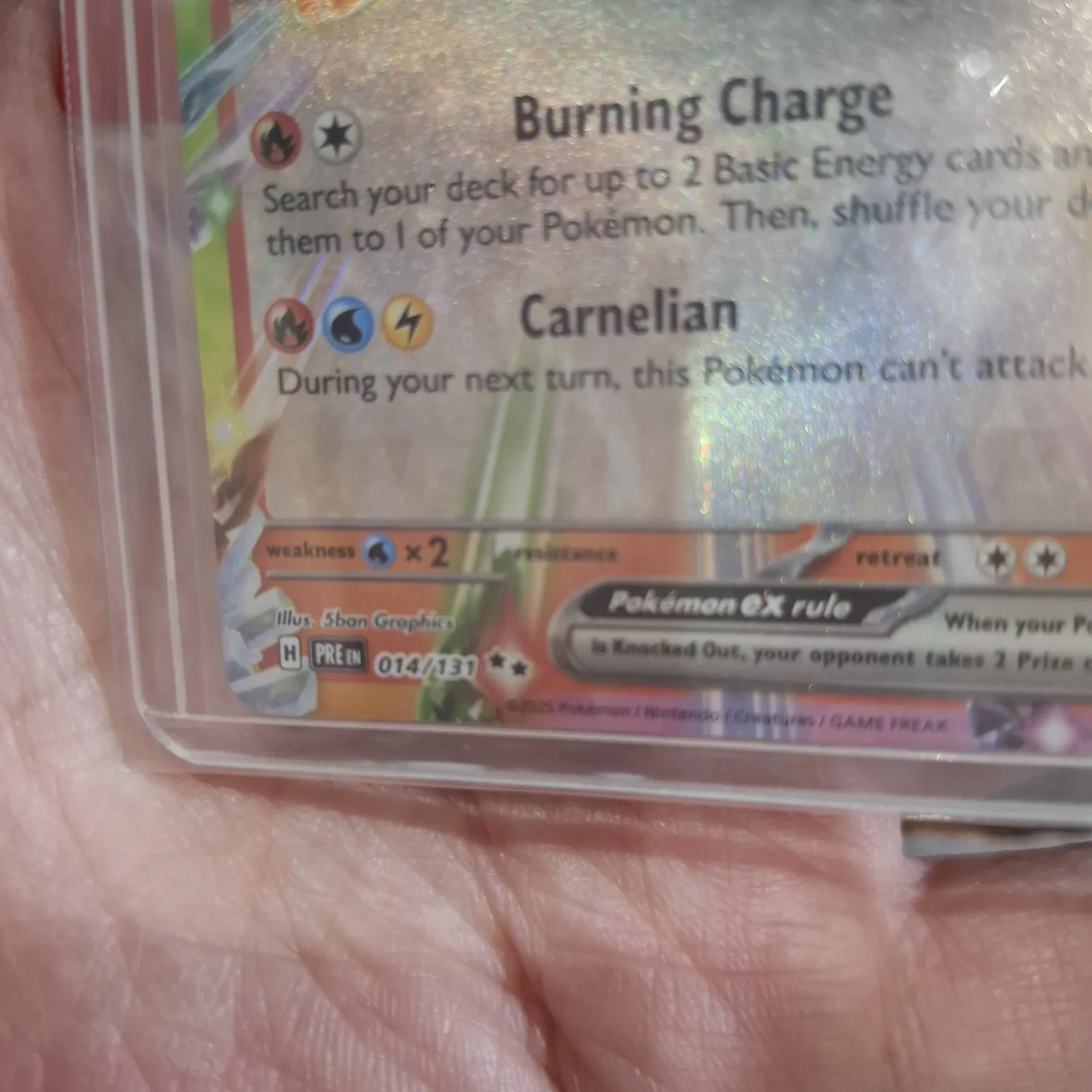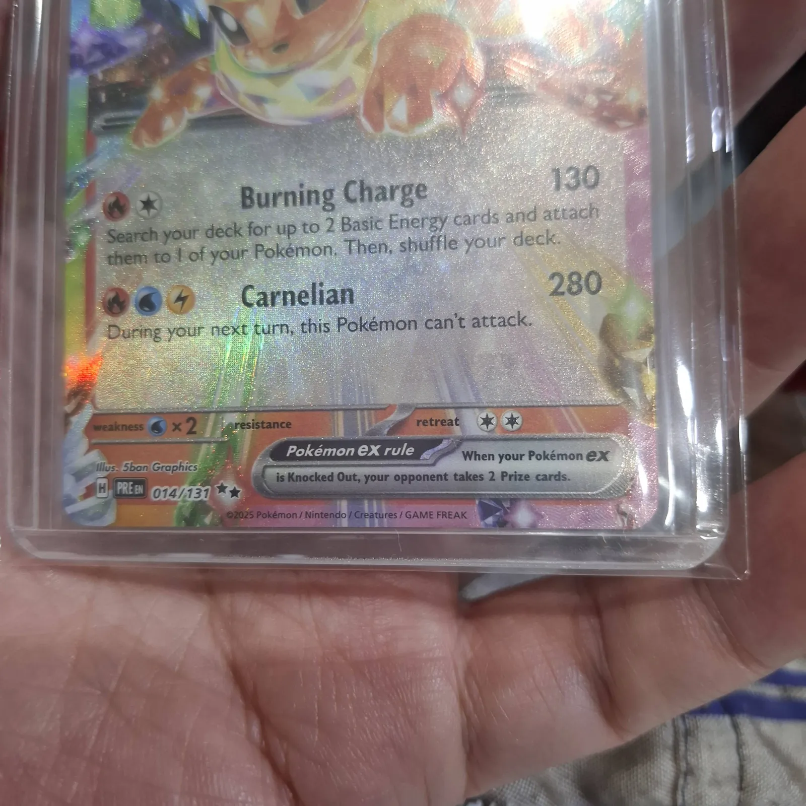Flareon ex from Pokemon TCG set, card number 14/131, featuring Tera effect holo art. This stage 1 fire-type Pokemon card showcases Flareon ex with 270 HP and notable attacks Burning Charge and Carnelian. Foil treated with a unique crystalline pattern illustration. Playable in various formats with strategic bench protection. Artist and further card code details not available.