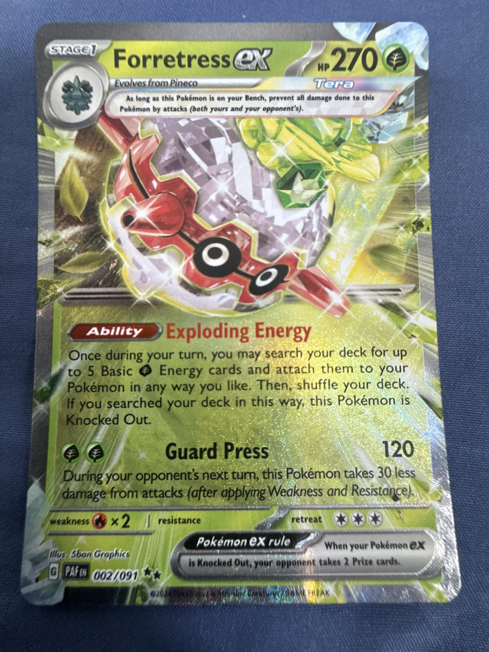 Forretress ex card with collector number 002/091 from the Pale Moon set in Japanese. Illustrated by 5ban Graphics. This is a holofoil card. Ability: Exploding Energy; Attack: Guard Press 120. Playable in meta. Card code PAF-002. The card is foil and features Tera evolution mechanic.