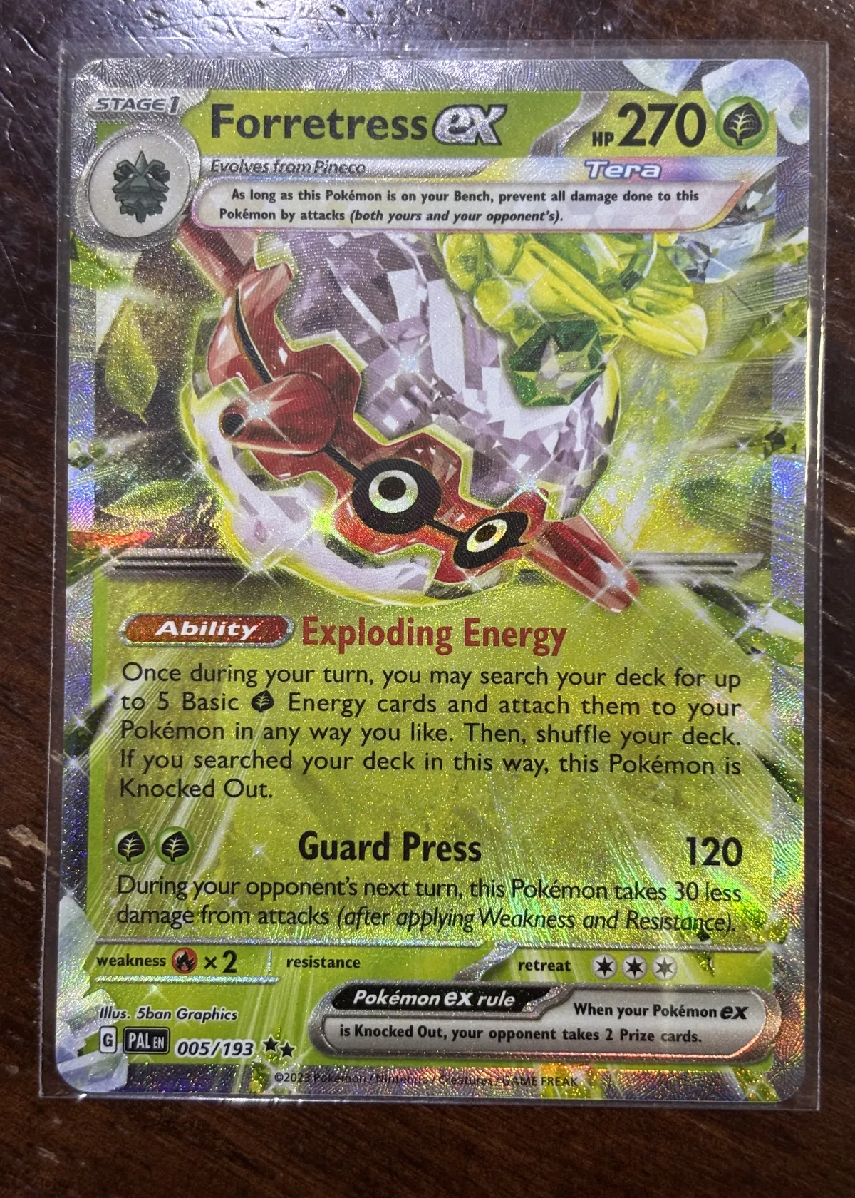 This Forretress ex card is from the 2023 Pokémon TCG set, numbered 005/193. It features a stunning full-art holographic foil design by 5ban Graphics, showcasing Forretress with Tera energy. The card is a Stage 1 Grass-type with 270 HP, notable for its Exploding Energy ability that allows deck searching for up to 5 Basic Grass Energy cards at the cost of knocking itself out. Its Guard Press attack deals 120 damage and reduces damage taken on your opponent's next turn.