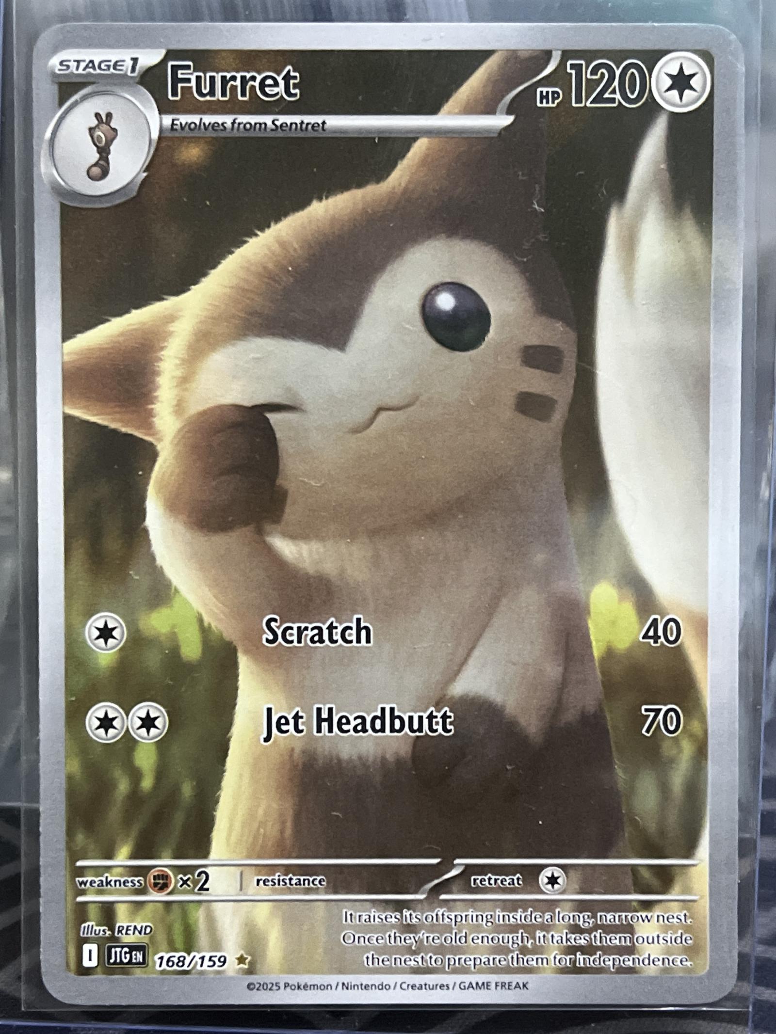 Furret card from the English Pokemon TCG set 2025. Collector number 168/159. Illustrated by REND. This is a holo alternate art card featuring Furret with 120 HP and two attacks: Scratch and Jet Headbutt. The card is foil and is primarily collectible with some limited playability in casual decks.