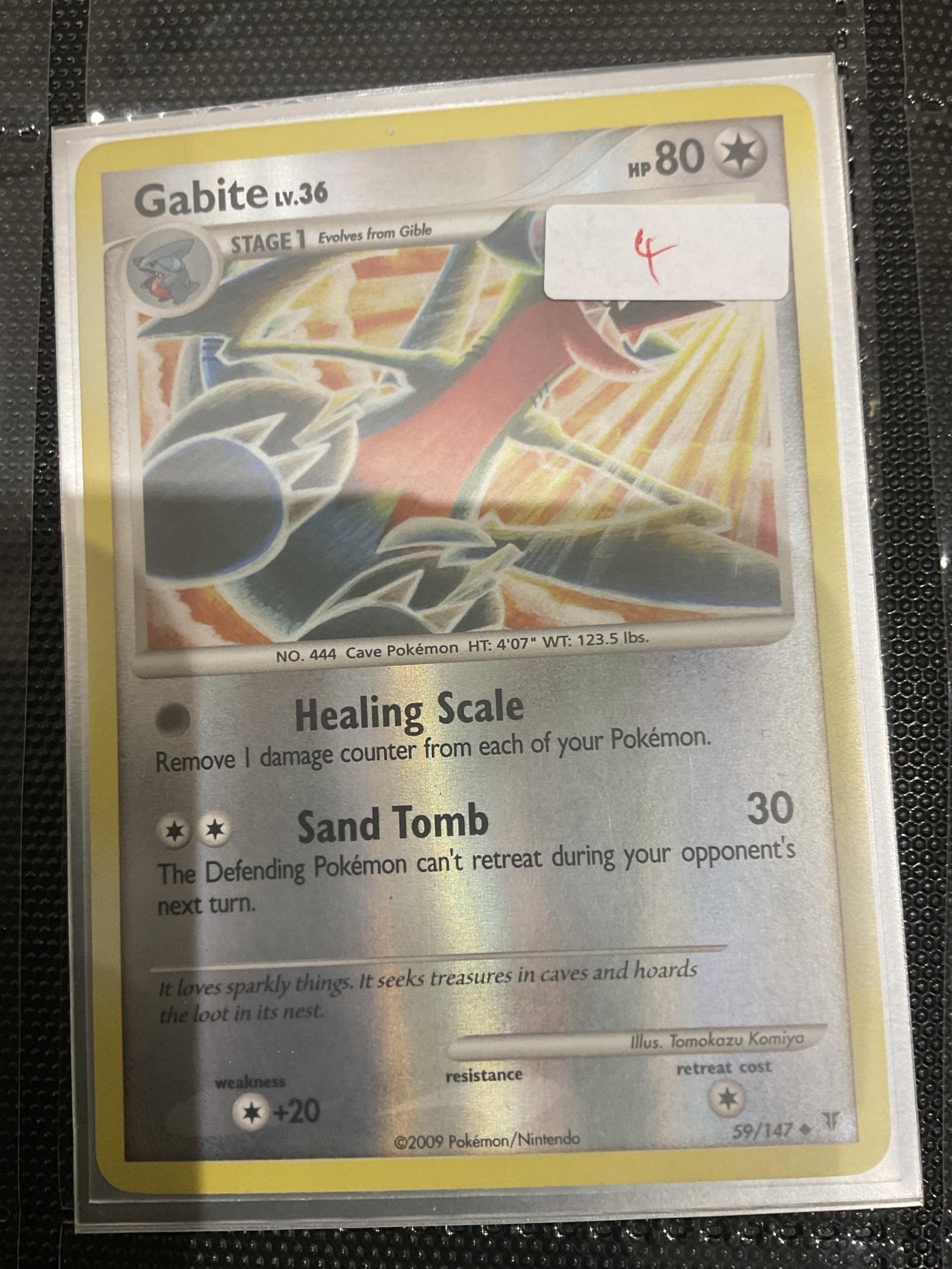 Gabite Lv.36 holographic rare card from the 2009 Diamond & Pearl set by artist Tomokazu Komiya. Card number 59/147. This card features the Healing Scale and Sand Tomb moves. It is a foil card and part of the playable Pokémon TCG meta.