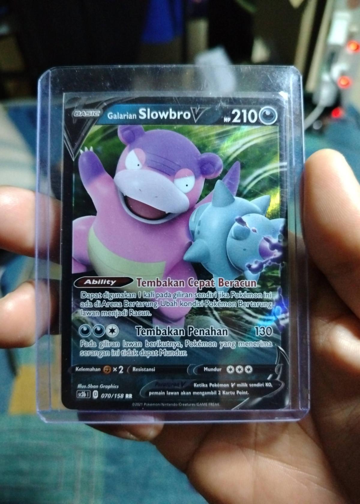 Playability & collectible value This Galarian Slowbro V can be both a collectible display piece and a situational playable card depending on format and local meta. As a holofoil V it carries more collector interest than a regular reverse-holo, and the Indonesian printing adds regional variety for collectors who chase international prints or set variants.