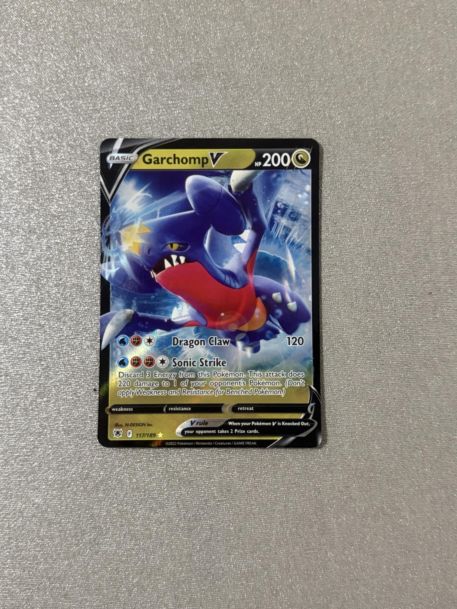 Garchomp V (117/189) from the Evolving Skies set, illustrated by N-DESIGN Inc. This is a holo foil card featuring Garchomp V with 200 HP and Dragon Claw and Sonic Strike attacks. Released in 2022, this card is playable in the current meta and is highly collectible. The card language is English and it is a part of the Sword & Shield series.
