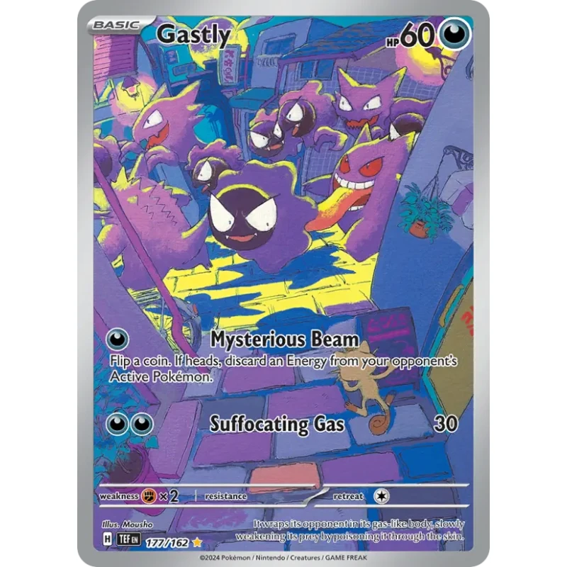 Gastly Pokémon trading card from the 2024 set, featuring full art holo design. Card number 177/162, illustrating Gastly with moves Mysterious Beam and Suffocating Gas. The card is sleeved for protection.