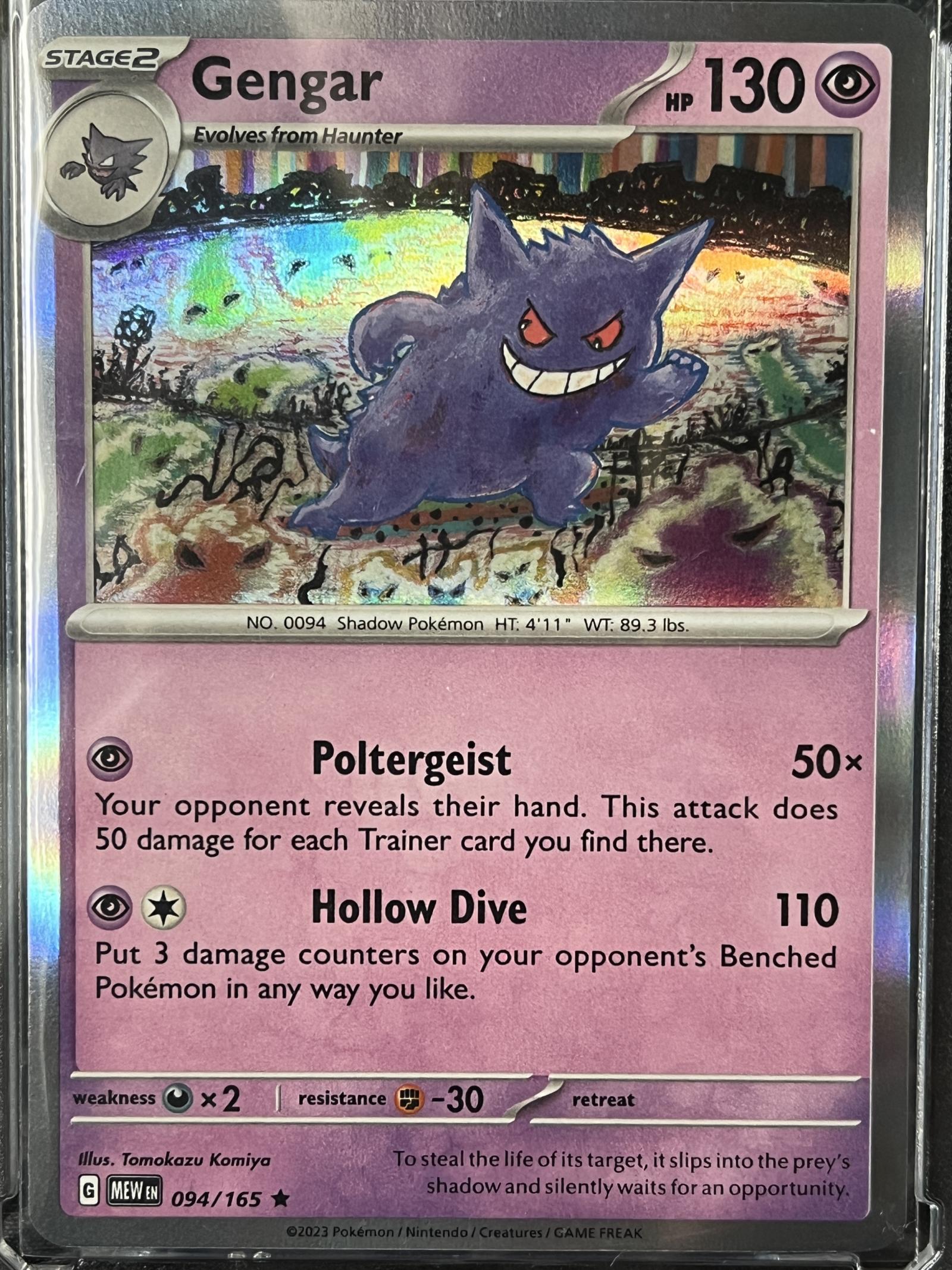 Gengar card number 094/165 from the MEW set, illustrated by Tomokazu Komiya. This is a holo foil card from 2023. It is playable in the current meta. The card features the attacks Poltergeist and Hollow Dive. Card code: 094/165.