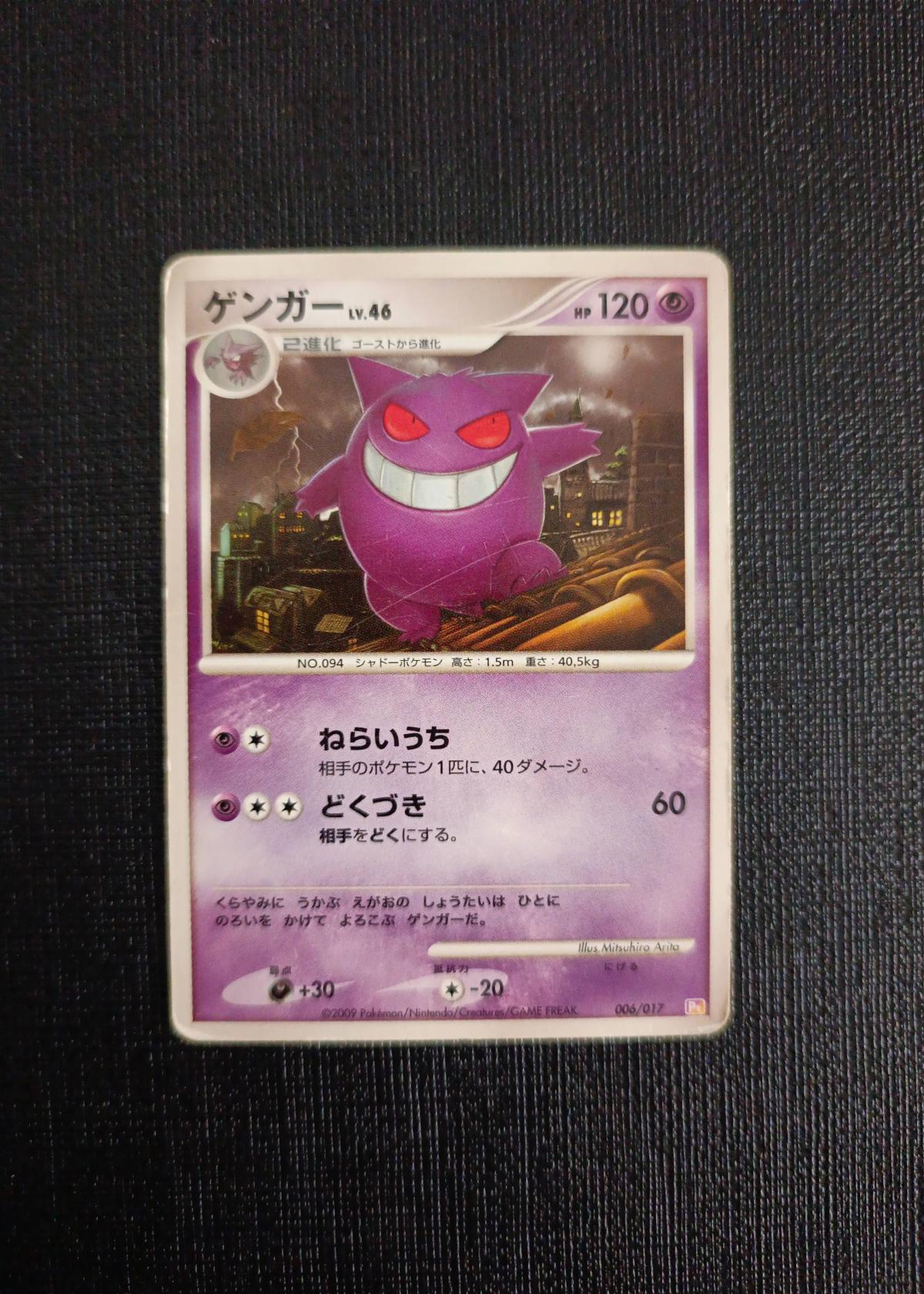 This is a Japanese Gengar card from the Pokémon TCG Platinum set, released in 2009 (set name: Pt2 Bonds to the End of Time). The card's collector number is 6/17. The artist is Mitsuhiro Arita. Card code: 094. This card features a foil (holo) finish. Gengar cards tend to be more collectible due to their popularity and unique artwork but may see some meta play depending on format. Language is Japanese. Not graded or slabbed.
