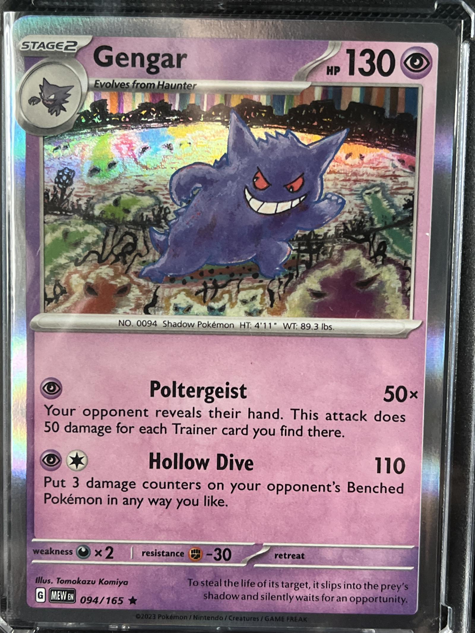 Gengar card from the MEW set (094/165), illustrated by Tomokazu Komiya. This card is a holo rare featuring the attacks Poltergeist and Hollow Dive. It is playable in the current meta and is printed in English. The card is foil with a holographic finish.