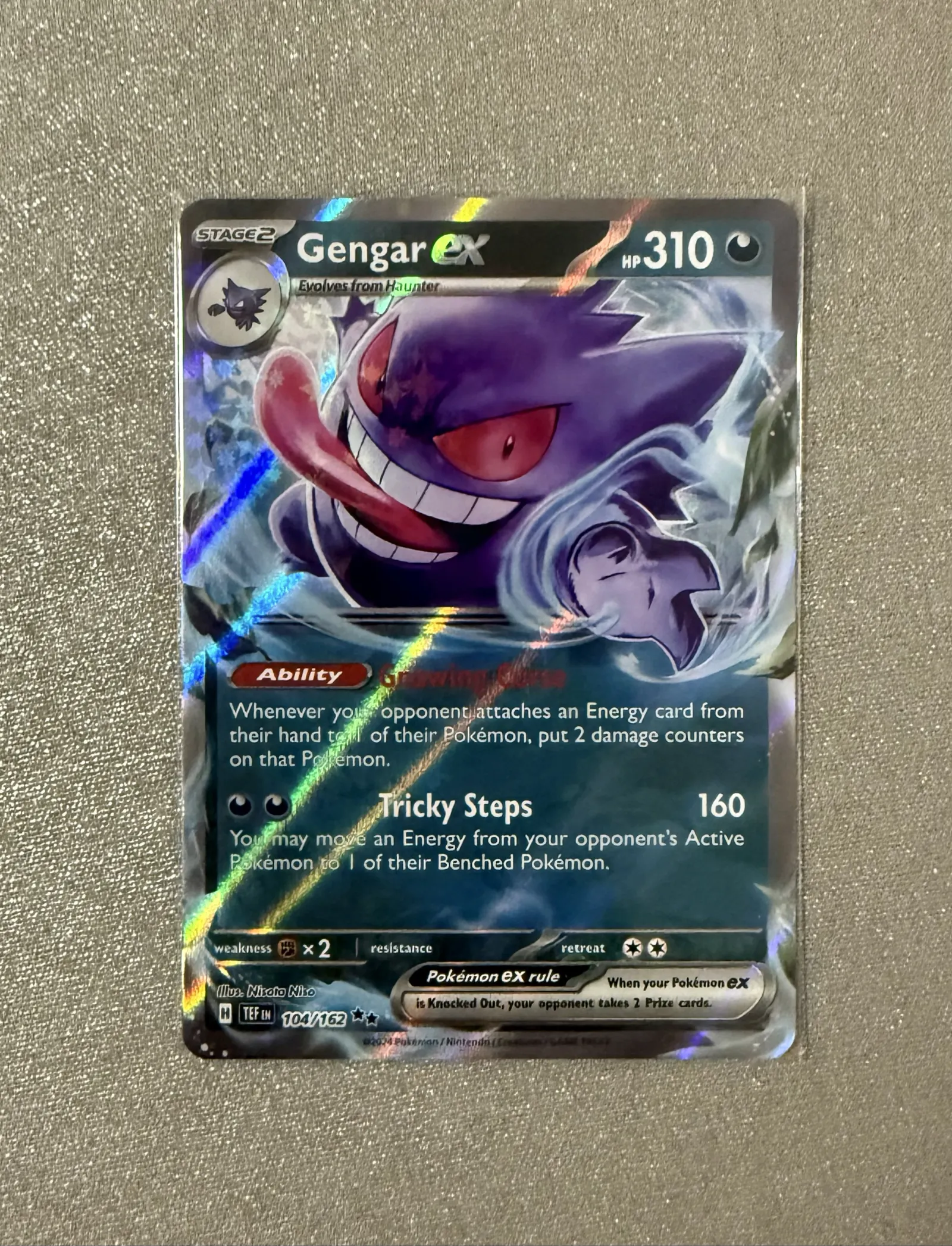Gengar ex card #104 from the Temporal Forces set (TEF). Artwork by Mitsuhiro Arita. This is a holo foil card in English. The card features Gengar ex with an ability and a powerful 'Tricky Steps' attack. Suitable for collectors and playable in the Pokemon TCG meta.