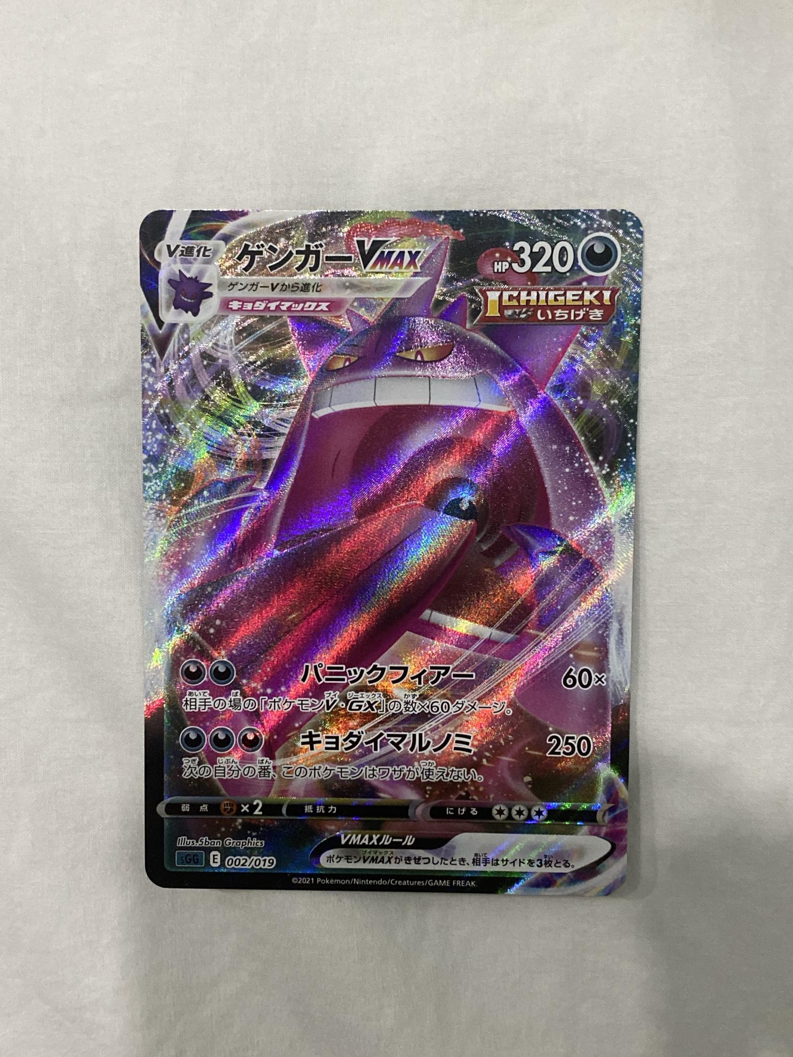 Card number 002/019 from the Ichigeki (Single Strike) set in the Japanese language. Features Gengar VMAX with 320 HP. Artwork by 5ban Graphics. This card has a holo foil treatment. The card is playable in the current meta and is a powerful VMAX evolution. The set is part of the Sword & Shield series released in 2021.