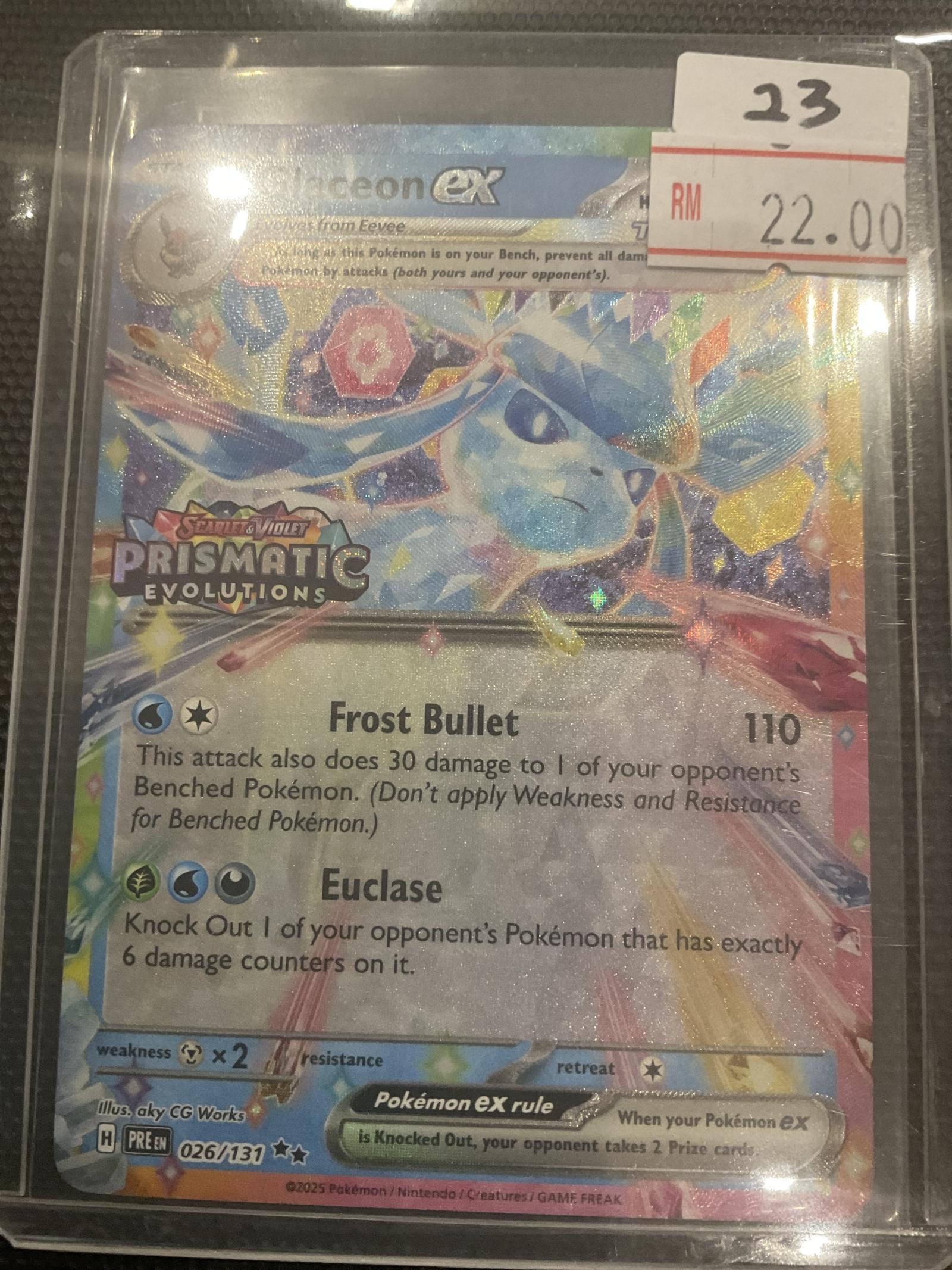 Glaceon ex card number 026/131 from the Prismatic Evolutions set (card code 026/131). Illustrated by aky CG Works. This is a full art foil card from the Scarlet & Violet expansion series. It features the moves Frost Bullet and Euclase. Playable in meta decks using Evolution ex cards. Condition and grading not specified.
