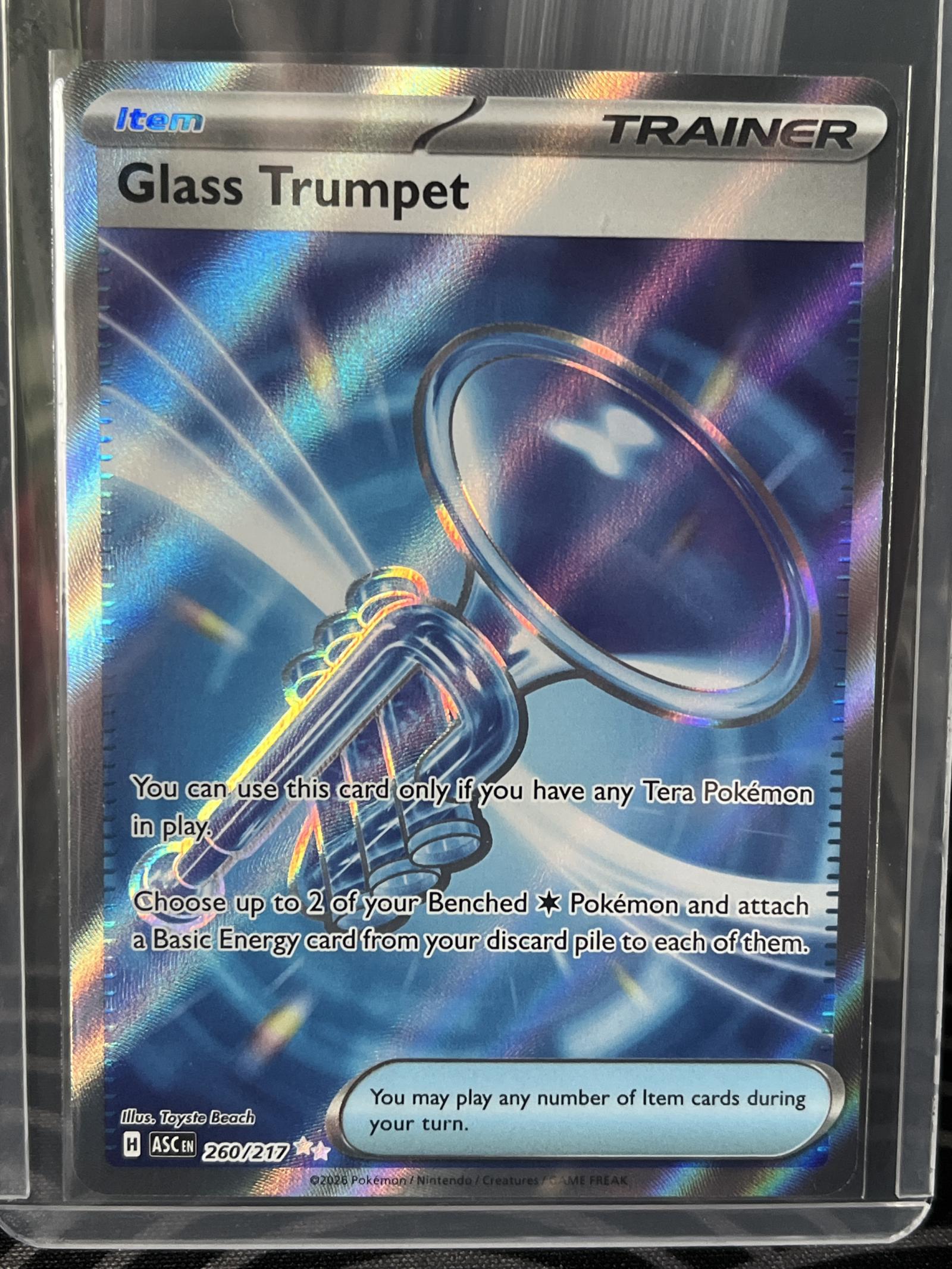Glass Trumpet Trainer card from Pokémon Scarlet & Violet set (260/217). Artist: Toyste Beach. Full art foil promotional card. This card is playable in the current meta, providing energy recovery for Tera Pokémon. Card code ASC EN 260217.