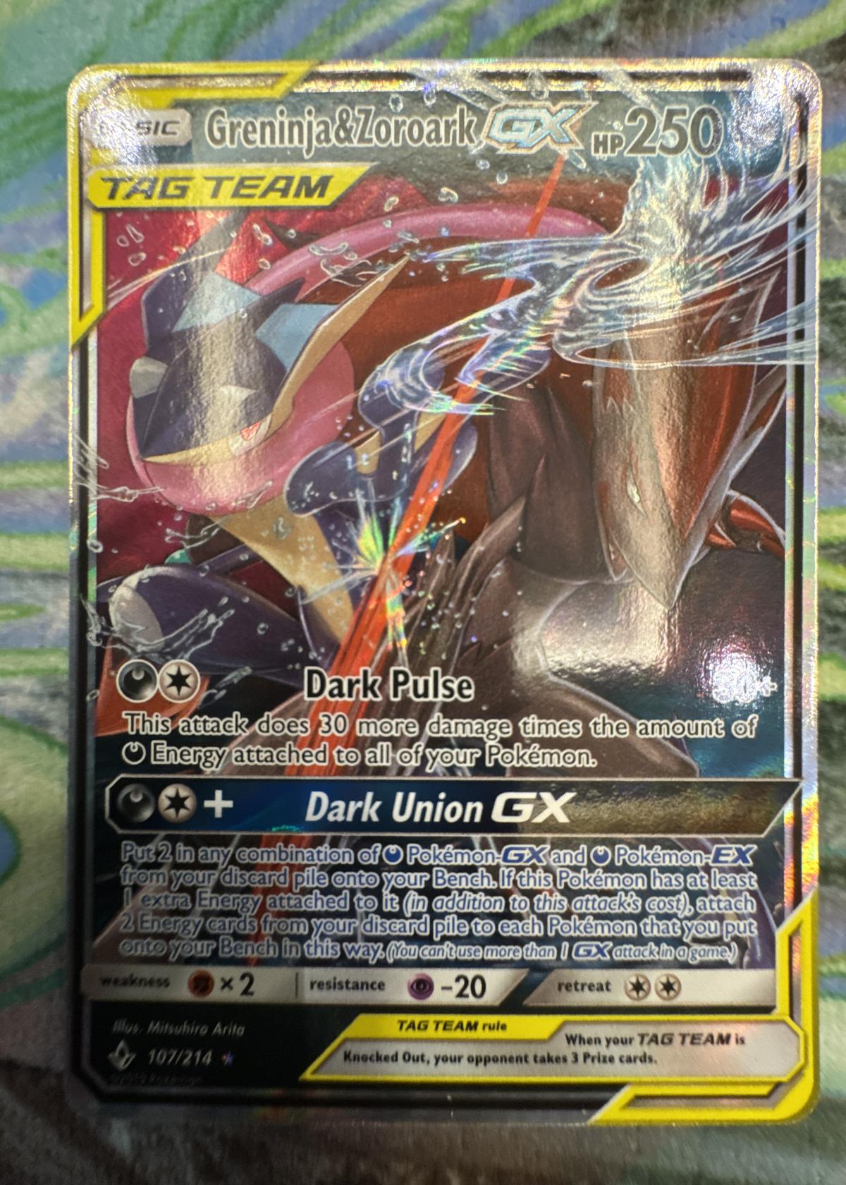 Greninja & Zoroark GX is a TAG TEAM Pokémon-GX card illustrated by Mitsuhiro Arita. This is card number 107 from the Sun & Moon: Unbroken Bonds set (code: UNB). The card features a holofoil printing treatment and displays stunning artwork of both Greninja and Zoroark. The card's 6-digit code is not available on the card. With 250 HP and powerful attacks like Dark Pulse and Dark Union GX, this card was popular in the meta when TAG TEAM Pokémon were legal, but is now mostly found in collector binders as it's no longer standard-playable. The card is in English and has the characteristic rainbow shimmer of a GX holofoil.