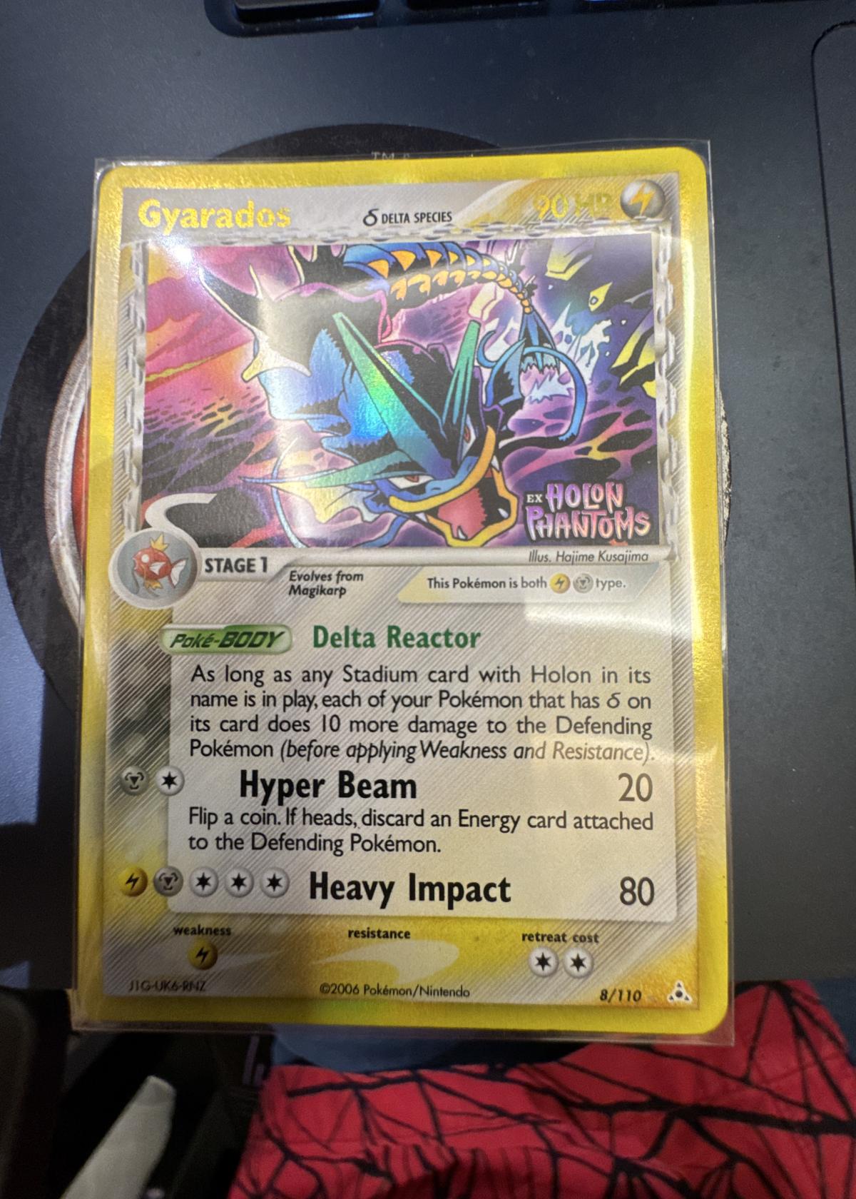 Gyarados δ (Delta Species) from the EX Holon Phantoms set, card number 8/110. This is a holofoil card illustrated by Hajime Kusajima. The set code is HP, and the card features the unique Delta Species trait and Poké-BODY ability 'Delta Reactor.' The card is mostly collectible and not highly playable in current meta. Card code: 51G-UKG-9NZ. First released in 2006. Not a graded or slabbed card.