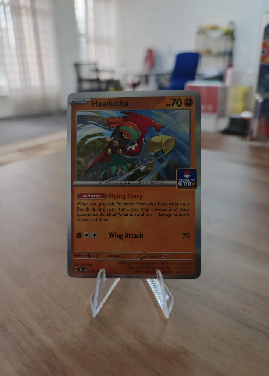 A great addition for collectors seeking special promo cards or fans of the Hawlucha character, this card stands out due to its regional Gym stamp and pristine condition.