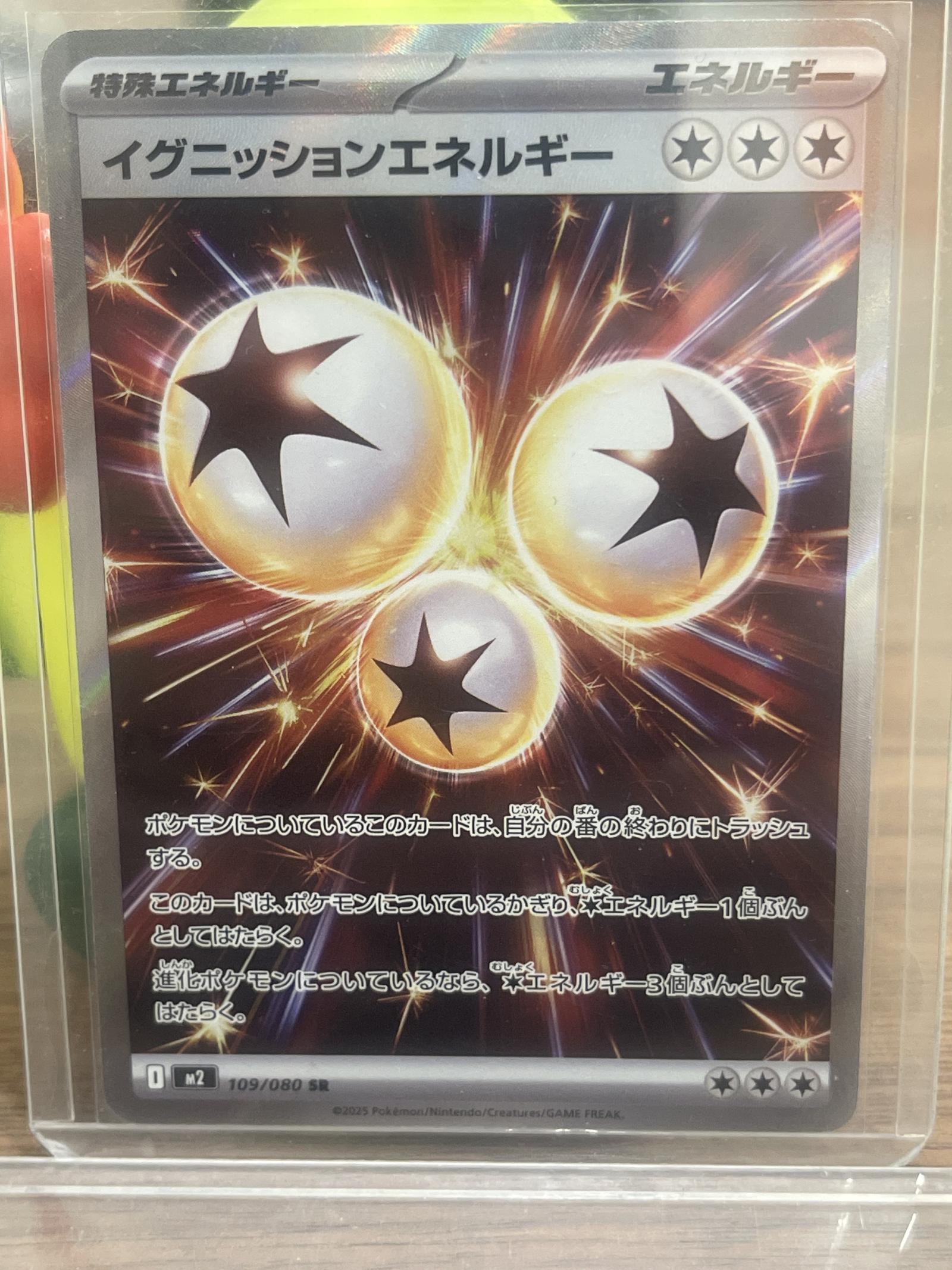 Japanese Ignition Energy card from the Pokémon TCG set with card number 109/080 SR. Card set code: M2. This card is a special Rare (SR) and features unique artwork. The card is in Japanese and has a holo foil treatment. It is a Trainer Energy card with strategic use in gameplay. The card code is 2023, and it is collectible and playable within the Pokémon TCG metagame.