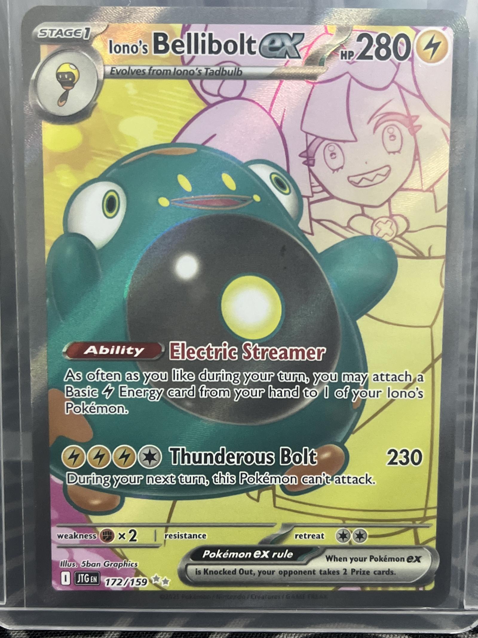 Iono's Bellibolt ex from the Pokemon TCG set Japanese Legendary Trainer Box (JTG). Card number 172/159, illustrated by 5ban Graphics. This is an ultra rare full art card featuring the Electric Streamer ability and Thunderous Bolt attack. It is in English and the card is highly collectible. Noted for its playability in certain Electric-type decks.